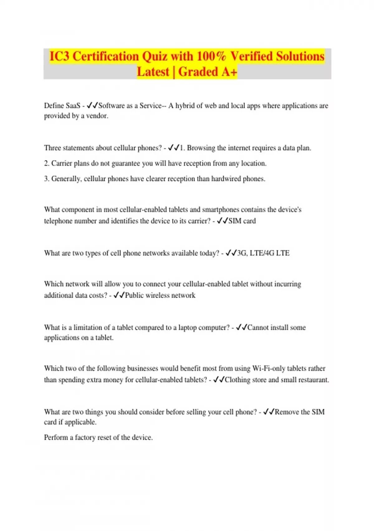 IC3 Certification Quiz with 100% Verified Solutions Latest | Graded A+ Define SaaS - Software as a Service-- A hybrid of web and local apps where applications are provided by a vendor. Three statements about cellular phones? - 1. Browsing the internet requires a data plan. 2. Carrier plans do not guarantee you will have reception from any location. 3. Generally, cellular phones have clearer reception than hardwired phones. What component in most cellular-enabled tablets and smartphones contains the device's telephone number and identifies the device to its carrier? - SIM card What are two types of cell phone networks available today? - 3G, LTE/4G LTE Which network will allow you to connect your cellular-enabled tablet without incurring additional data costs? - Public wireless network What is a limitation of a tablet compared to a laptop computer? - Cannot install some applications on a tablet