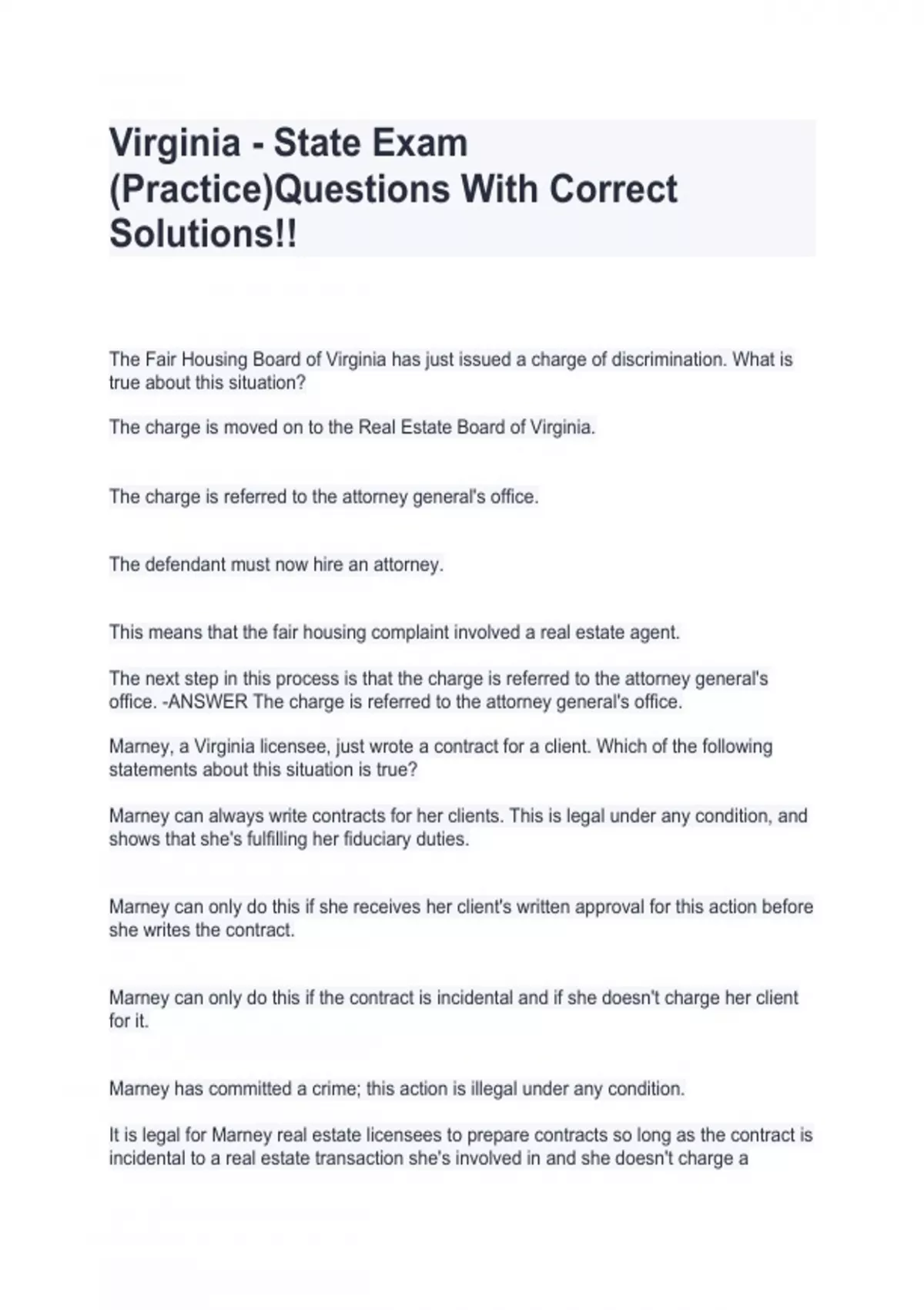 The Fair Housing Board of Virginia has just issued a charge of discrimination. What is true about this situation? The charge is moved on to the Real Estate Board of Virginia. The charge is referred to the attorney general's office. The defendant must now hire an attorney. This means that the fair housing complaint involved a real estate agent. The next step in this process is that the charge is referred to the attorney general's office. -ANSWER The charge is referred to the attorney general's office. Marney, a Virginia licensee, just wrote a contract for a client. Which of the following statements about this situation is true? Marney can always write contracts for her clients. This is legal under any condition, and shows that she's fulfilling her fiduciary duties. Marney can only do this if she receives her client's written approval for this action before she writes the contract. Marney can only do this if the contract is incidental and if she doesn't charge her client for it. Marney has committed a crime; this action is illegal under any condition. It is legal for Marney real estate licensees to prepare contracts so long as the contract is incidental to a real estate transaction she's involved in and she doesn't charge a separate fee for the service. -ANSWER Marney can only do this if the contract is incidental and if she doesn't charge her client for it. Which of these instances does NOT allow a broker to disburse escrow funds? All principals to the transaction have agreed, in writing, where the money should go. One of the principals to the transaction demonstrates, in writing, a clear financial need. The broker has received a court order that directs her to disburse the funds in a certain way. The related contract directs that the escrow funds be distributed in a certain way. -ANSWER One of the principals to the transaction demonstrates, in writing, a clear financial need. What are the two types of timeshare ownership? Freehold estate and estate for years Timeshare estate and timeshare use Timeshare limited and timeshare unlimited Timeshare vacation and timeshare interval -ANSWER Timeshare estate and timeshare use Which of the following examples describes a condominium? Ownership of all units in the complex is shared equally among investors. Ownership of the pool, grassy areas, and walkways is shared, while units are privately owned. Privately owned units that share a common wall. Rooms within a home are single-occupancy, and common areas such as the kitchen are shared. -ANSWER Ownership of the pool, grassy areas, and walkways is shared, while units are privately owned. Virginia law requires that real estate transaction documents be _______. Converted to paper and stored on site Copied at least five times Protected by encryption and cloud-based backup Readily available upon Virginia Real Estate Board request -ANSWER Readily available upon Virginia Real Estate Board request When does a designated agency disclosure need to be provided? Never Only when representing a buyer and interacting with an unrepresented seller Only when representing the seller and interacting with an unrepresented buyer Prior to a designated agency situation occurring -ANSWER Prior to a designated agency situation occurring Elizabeth is selling her home. She wants an agent who will be with her every step of the process and can advise her, as needed. Which of the following relationships may be best for Emily? Buyer's agent Dual agent Limited service agent Standard agent -ANSWER Standard agent Leon's client is looking for a property with at least 2,500 finished square feet. He finds a 2,200-square-foot property with all the other features the client is looking for and purposely fails to mention the square footage. His client agrees to look at the property, falls in love with it, and wants to make an offer. Which of these statements accurately represents Leon's level of misrepresentation in this situation? Because Leon didn't state the square footage, he's not guilty of misrepresentation. It's the buyer's responsibility to ensure that the property has the proper square footage, so Leon's in the clear. Leon obviously knew about the square footage and intentionally didn't mention it. He's guilty of intentional misrepresentation. Leon omitted a material fact. This is considered unintentional misrepresentation. -ANSWER Leon obviously knew about the square footage and intentionally didn't mention it. He's guilty of intentional misrepresentation. If an out-of-state licensee is seeking to obtain a Virginia broker's license by reciprocity, how much experience must they have? 12 of the last 36 months 24 of the last 48 months 36 of the last 48 months Six of the last 12 months -ANSWER 36 of the last 48 months What is a seller representation agreement also known as? A designated agency disclosure A disclosure to unrepresented parties A listing agreement A purchase agreement -ANSWER A listing agreement Which of the following is required of limited service agents? They must be paid up front. They must disclose any material facts they are aware of or that are reasonable apparent. They must inspect all properties they are listing on the MLS. They must perform all duties required by statute. -ANSWER They must disclose any material facts they are aware of or that are reasonable apparent. Philip tells his agent, Jeff, "I know for a fact that there have been three homicides in this house. What are buyers going to think about this?" What should Jeff say? "If I tell buyers this, I could be found guilty of negligence to you, so don't worry. Mum's the word." "My duties toward the public include disclosing information like this, so I'll have to mention this to potential buyers." "This is something we have to disclose only if we're asked about it directly. Otherwise, we don't have to mention it." "This sort of information has its own mandatory disclosure form in Virginia, so it'll have to come out eventually." -ANSWER "If I tell buyers this, 