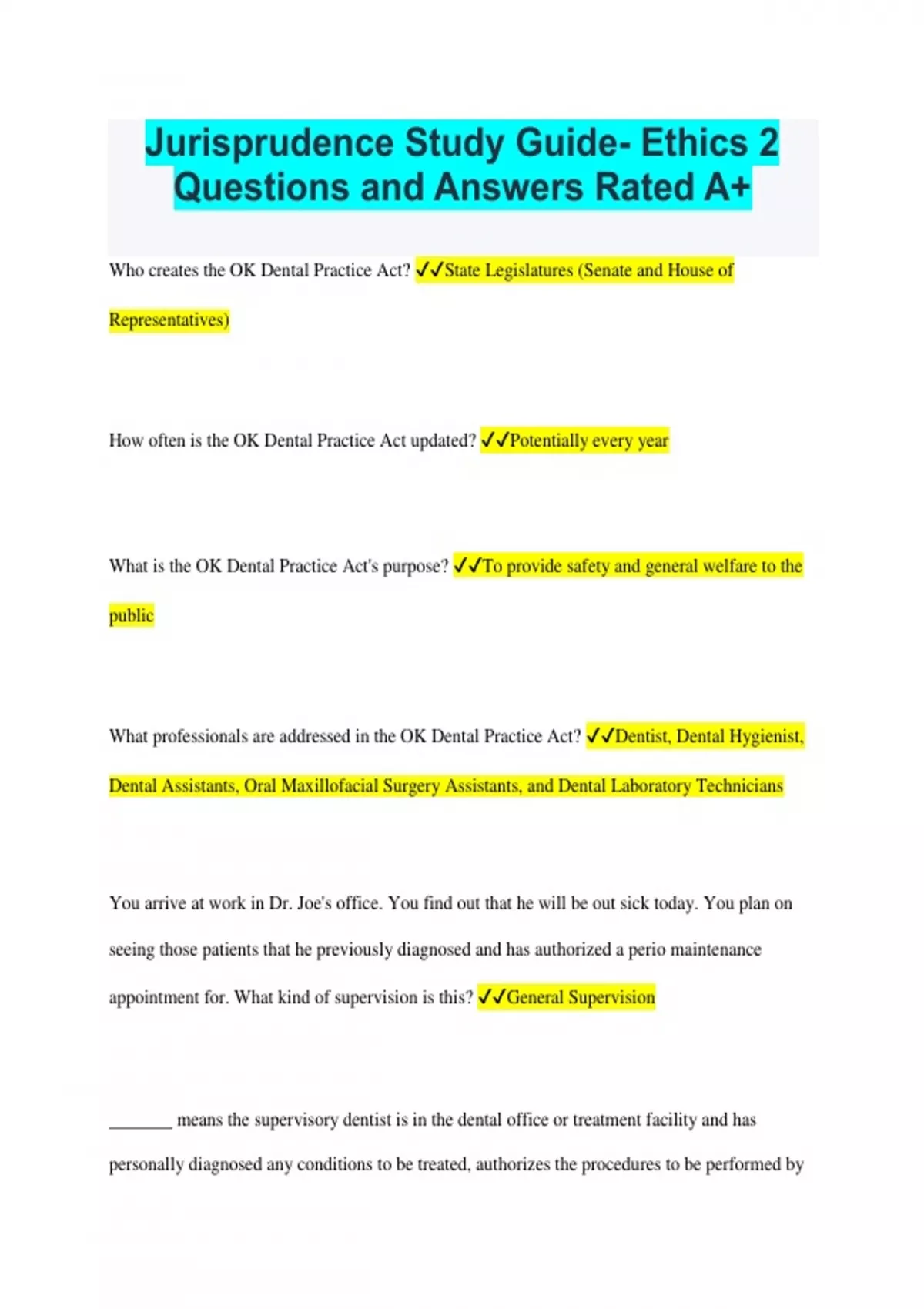 Jurisprudence Study Guide- Ethics 2 Questions and Answers Rated A+ Who creates the OK Dental Practice Act? State Legislatures (Senate and House of Representatives) How often is the OK Dental Practice Act updated? Potentially every year What is the OK Dental Practice Act's purpose? To provide safety and general welfare to the public What professionals are addressed in the OK Dental Practice Act? Dentist, Dental Hygienist, Dental Assistants, Oral Maxillofacial Surgery Assistants, and Dental Laboratory Technicians You arrive at work in Dr. Joe's office. You find out that he will be out sick today. You plan on seeing those patients that he previously diagnosed and has authorized a perio maintenance appointment for. What kind of supervision is this? General Supervision _______ means the supervisory dentist is in the dental office or treatment facility and has personally diagnosed any conditions to be treated, authorizes the procedures to be performed by a dental hygienist, remains in the dental office or treatment facility while the procedures are being performed, and will evaluate the results of the dental treatment within a reasonable time as determined by the nature of the procedures performed, the needs of the patient, and the professional judgment of the supervisory dentist. Indirect Supervision _____ supervision can be used with recall patients and the DDS is in the office. Indirect Supervision In order to apply for a dental hygiene license in Oklahoma, what must you submit to the Oklahoma Board of Dental Examiners? •Non-Refundable Fee with Completed Application ($100) •Original National Board Scores/ Certified copy of National Board Scores •Regional Exam Scores (WREB Scores) •Copy of Diploma •Official Transcripts •Verification Report from the National Practitioner Databank •Verification From Any Other State You Are Licensed In With State Seal •3 Letters of Recommendation •Proof of Citizenship (Birth Certificate) or Qualified Alien Documentation (Passport) •Copy of Legal Documentation to show any name change(s) •Personal Interview (if requested by the Board or Investigator) •Jurisprudence Exam •Criminal background check (Fingerprint card) Can out-of-state hygienists volunteer at Oklahoma MOM? Yes, If they establish a special volunteer license by the OK Board of Dentistry. Can a newly licensed dental hygienist from Texas request an Oklahoma license? NO - The Board of Dentistry may issue a license to practice dental hygiene, without examination, to an out-of-state dental hygienist who has been engaged in the active practice of dental hygiene in another state or territory for at least two (2) years. The Board of Dentistry may issue a license to practice dental hygiene, without examination, to an out-of-state dental hygienist who has been engaged in the active practice of dental hygiene in another state or territory for at least____. two (2) years Can an out-of-state licensed dental hygienist get a temporary license in Oklahoma? YES- The Board of Dentistry may issue a temporary license to practice dental hygiene, without examination, to an out-of- state dental hygienist who has been engaged in the active practice of dental hygiene in another state or territory during the two (2) years immediately preceding application upon presentation to the Board of a certificate from the Board of Dental Examiners or a like dental hygiene licensing agency of that state or territory, certifying that the applicant is in good standing with the agency and upon