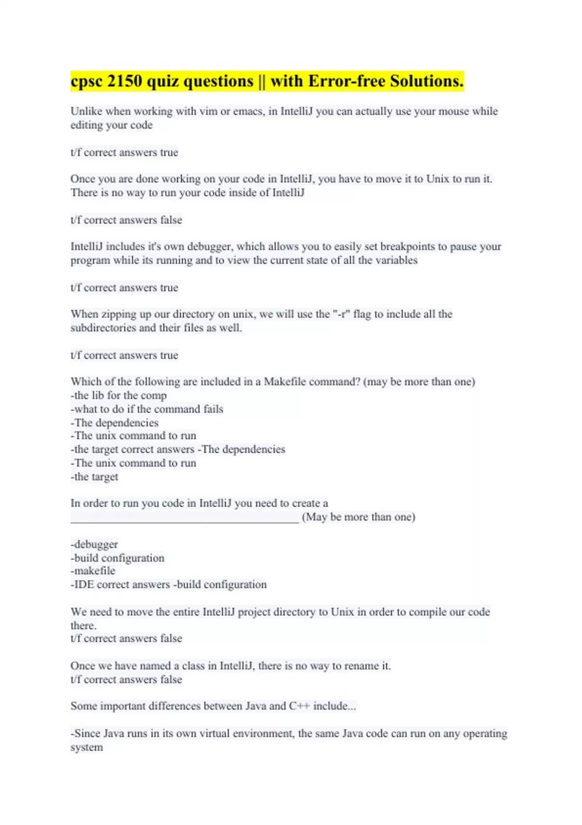 Unlike when working with vim or emacs, in IntelliJ you can actually use your mouse while editing your code t/f correct answers true Once you are done working on your code in IntelliJ, you have to move it to Unix to run it. There is no way to run your code inside of IntelliJ t/f correct answers false IntelliJ includes it's own debugger, which allows you to easily set breakpoints to pause your program while its running and to view the current state of all the variables t/f correct answers true When zipping up our directory on unix, we will use the "-r" flag to include all the subdirectories and their files as well. t/f correct answers true Which of the following are included in a Makefile command? (may be more than one) -the lib for the comp -what to do if the command fails -The dependencies -The unix command to run -the target correct answers -The dependencies -The unix command to run -the target In order to run you code in IntelliJ you need to create a _______________________________________ (May be more than one) -debugger -build configuration -makefile -IDE correct answers -build configuration We need to move the entire IntelliJ project directory to Unix in order to compile our code there. t/f correct answers false Once we have named a class in IntelliJ, there is no way to rename it. t/f correct answers false Some important differences between Java and C++ include... -Since Java runs in its own virtual environment, the same Java code can run on any operating system