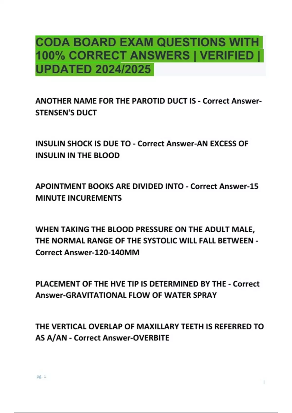 CODA BOARD EXAM QUESTIONS WITH CORRECT ANSWERS | 100% VERIFIED | UPDATED 2024/2025. INSULIN SHOCK IS DUE TO - Correct Answer-AN EXCESS OF INSULIN IN THE BLOOD APOINTMENT BOOKS ARE DIVIDED INTO - Correct Answer-15 MINUTE INCUREMENTS WHEN TAKING THE BLOOD PRESSURE ON THE ADULT MALE, THE NORMAL RANGE OF THE SYSTOLIC WILL FALL BETWEEN - Correct Answer-120-140MM PLACEMENT OF THE HVE TIP IS DETERMINED BY THE - Correct Answer-GRAVITATIONAL FLOW OF WATER SPRAY THE VERTICAL OVERLAP OF MAXILLARY TEETH IS REFERRED TO AS A/AN - Correct Answer-OVERBITE pg. 2 l FIRST AID FOR A PT GOING INTO INSULIN SHOCK IS TO - Correct Answer-HAVE THE PT INGEST CANDY OR FRUIT DRINK THE FOLLOWING CONDITION FREQUENTLY ACCOMMODATES AN EPILEPTIC SEIZURE - Correct Answer-CLENCHING OF TEETH DETERMINGING THE CONDITION OF THE PULP OF A TOOTH IS ACCOMPLISHED WITH - Correct Answer-ELECTRONIC PULP TESTER A LINE ANGLE IS - Correct Answer-TWO SURFACES THAT MEET ANGINA PECTORIS IS - Correct Answer-A PAINFUL CONDITION IN THE CARDIAC REGION A PT SCHEDULED FOR A DENTAL SURGERY USING LOCAL ANESTHTIC IS CAUTIONED AGAINST USING ____________ PRIOR TO THE SURGERY - Correct Answer-ALCOHOL WHEN SCHEDULING A PT FOR ORAL SURGERY THE MEDICAL HISTORY SHOULD BE CHECKED FOR WHICH OF THE pg. 3 l FOLLOWING POSSIBLE COMPLICATIONS - Correct AnswerHEMOPHILIA A DRUG TO ALLEVIATE AN ATTACK OF ANGINA PECTORIS IS - Correct Answer-NITROGLYCERIN THE MOST COMMONLY USED METHOD OF ANNOTATING TEETH ADOPTED BY THE AMERICAN DENTAL ASSOCIATION I - Correct Answer-UNIVERSAL NUMBERING SYSTEM SURGICAL PT EXPERIANCING A POSTOPERATIVE UPSET STOMACH ARE TOLD TO - Correct Answer-DRINK GINGER ALE A PREVENTATIVE MESURE WHICH THE ASSISTANT CAN DO FOR THE PT WHO IS IN AN EPILEPTIC SEIZURE IS - Correct Answer-PROTECT THE PT FROM SELF INJURY THE ANATOMICAL TOOTH IS DIVIDED INTO - Correct AnswerSIXTHS A PT'S HEALTH HISTORY MUST INCLUDE - Correct Answer-AN ADDRESS A SOCIAL SECURITY NUMBER pg. 4 l THE PLACE OF EMPLOYMENT AN INDICATING FACTOR THAT A PT REQUIRES CPR IS - Correct Answer-LACK OF PULSE A TRAY SETUP FOR A CROWN AND BRIDGE CEMENTATION INCLUDES A/AN - Correct Answer-SICKLE SCALER A QUADRENT IN AN ADULT MOUTH IS __________ TEETH - Correct Answer-8 TREATMENT RECOMMENDED A THE ONSET OF RESPIRATORY ARREST IS - Correct Answer-MOUTH TO MOUTH RESUSCITATION TOPICAL ANESTHETIC APPLICATION IS DONE WITH A/AN - Correct Answer-COTTON TIP APPLICATOR/SPRAY EXFOLIATION OF A PRIMARY TOOTH IS OCCURS BY - Correct Answer-ROOT RESORPTION OF THE PRIMARY TOOTH pg. 5 professoraxe l A NORMAL DIASTOLIC BLOOD PRESSURE READING FOR AN ADULT IS __________ MM - Correct Answer-80 EPINEPHRINE IMPREGNANTED CORD IS USED TO - Correct Answer-STOP GINGIVAL BLEEDING AND RETRACT THE GINGIVA IN A BONDING PROCESS THE CONPOSITE RESINS ARE USED TOGETHER WITH - Correct Answer-ACID-ETCH TECHNIQUE A TWO SURFACE CAVITY ON THE GINGIVAL PORTION OF THE RIGHT BICUSPID IS - Correct Answer-CLASS V A FUNCTION OF FIXED BRIDGE IS TO - Correct AnswerPREVENT MOVEMENT OF THE TEETH THE ABBREVIATION "q" MEANS - Correct Answer-EVERY A PERSON IN THE STATE OF SHOCK WILL SHOW THE FOLLOWING SIGNS - Correct Answer-COOL, PALE SKIN DILATED PUPILS SHALLOW BREATHING pg. 6 professoraxe l THE ASSISTANT'S EYE LEVEL WHEN SEATED IS - Correct Answer-FOUR TO SIX INCHES ABOVE THAT OF THE DENTIST THE MOST COMMON EMERGENCY THAT OCCURS IN THE DENTAL OFFICE IS - Correct Answer-SYNCOPE A PT'S RECORDS WHICH RECORD THE RENDERING OF DENTAL SERVICES ARE CLASSIFIED AS - Correct Answer-CLINICAL TOPICAL ANESTHETIC IS EFFECTIVE ON - Correct Answer-ORAL MUCOSA THE FOLLOWING IS NOT A SUPPORTING TOOTH STRUCTURE - Correct Answer-ENAMEL WHEN GIVING CPR, THE VICTIMS HEAD SHOULD BE - Correct Answer-LEVEL WITH THE CHEST PERCEPTION WRITING REQUIRES THE USE OF VARIOUS ABBREVIATIONS. THE ABBREVIATION Q.I.D MEANS - Correct Answer-FOUR TIMES DAILY pg. 7 professoraxe l A FACTOR IN A PT'S MEDICAL HISTORY REQUIRING THE DENTIST'S IMMEDIATE ATTENTION IS - Correct AnswerHEMOPHILIA THE ASSISTANT MAY GENTLY APPLY PRESSURE TO THE PT'S ARM DURING THE LOCAL ANESTHETIC INJECTION TO - Correct Answer-RESTRICT SUDDEN MOVEMENT THE MOST VITAL SUBSTANCE OF A TOOTH IS THE - Correct Answer-PULP AFTER THE EXTRACTION OF A TOOTH THE PT IS INSTRUCTED TO - Correct Answer-STAY CLOSED ON GAUZE FOR 30-45 MINUTES