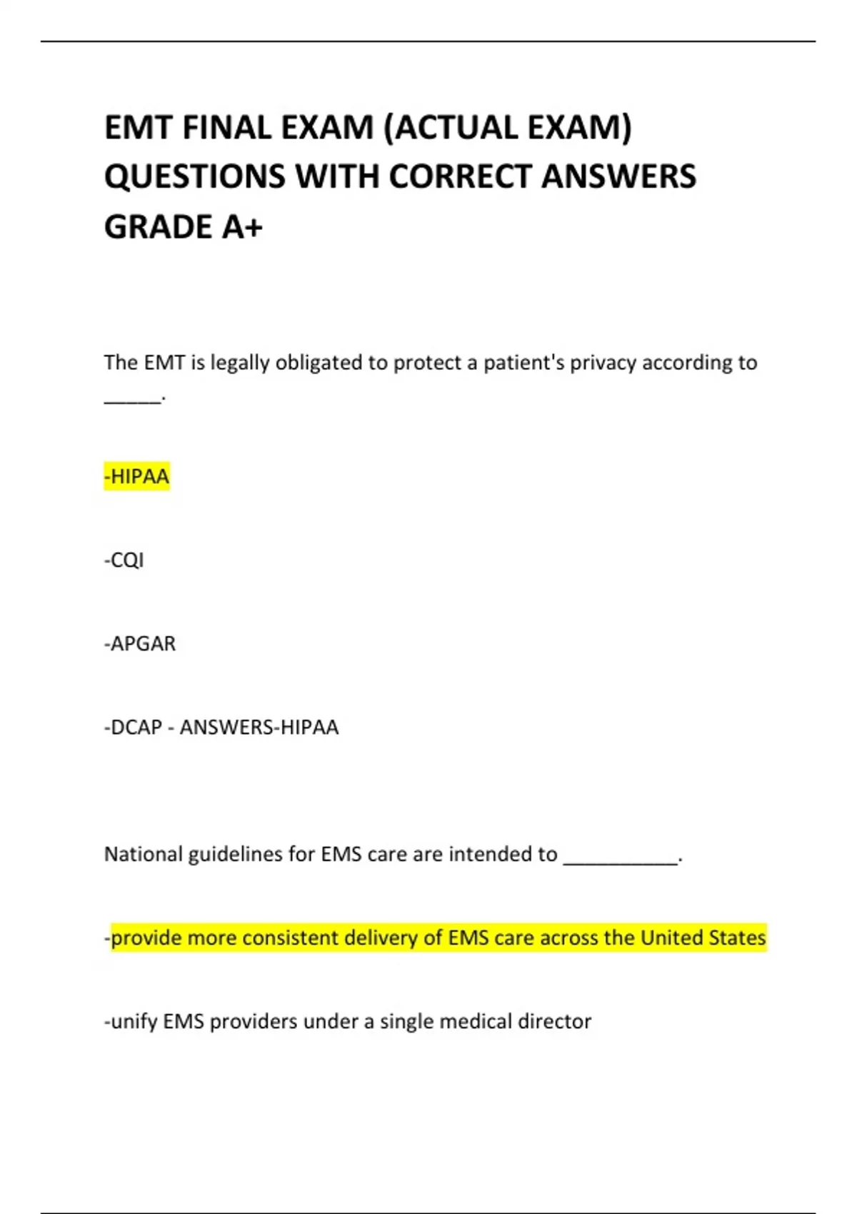 EMT FINAL EXAM (ACTUAL EXAM) QUESTIONS WITH CORRECT ANSWERS GRADE A+