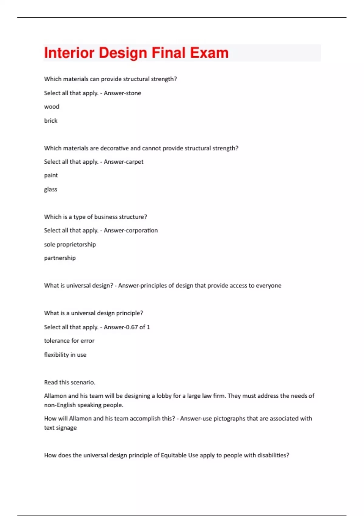 Which materials can provide structural strength? Select all that apply. - Answer-stone wood brick Which materials are decorative and cannot provide structural strength? Select all that apply. - Answer-carpet paint glass Which is a type of business structure? Select all that apply. - Answer-corporation sole proprietorship partnership What is universal design? - Answer-principles of design that provide access to everyone What is a universal design principle? Select all that apply. - Answer-0.67 of 1 tolerance for error flexibility in use Read this scenario. Allamon and his team will be designing a lobby for a large law firm. They must address the needs of non-English speaking people. How will Allamon and his team accomplish this? - Answer-use pictographs that are associated with text signage How does the universal design principle of Equitable Use apply to people with disabilities?Select all that apply. - Answer-has access to quality seating in theaters and elsewhere has the ability to enter a building at the same entrance What problem shows that the universal design principle of Size and Space for Approach and Use was not adhered to? - Answer-a narrow restroom cubicle What decade signaled the advent of neutral colors and bold features such as art, vases, and sofas? - Answer-XXX 1960s XXX 1970s What sorts of furniture styles and interiors in the US were inspired by Japan and China when the trade routes to the Far East were opened in the late 19th century? Select all that apply. - Answer-decorative hand-painted flowers or scenery furniture low to the floor silk and bamboo materials Which style is characterized by function, with furniture being used for more than one purpose? - Answer-mid-century modern Which are the furnishings that typify the art deco style in today's designs? Select three that apply. - Answer-tubular chrome and glass geometric shapes and mirrored accents luxurious materials like jade or silver What is a use of textiles in interior design products? Select three that apply. - Answer-wallpaper rugs upholstery Which is a principle of design? Select all that apply. - Answer-Rhythm UnityBalance Santone's client has said that he wants a pop of color in the office space that Santone is designing. What would be the color scheme that Santone should consider? - Answer-complementary How can an interior designer show empathy to the client? Select two that apply. - Answer-by considering the client's experiences by thinking about the client's needs Which aspect of design is an important concern that offices and stores share? - Answer-adequate lighting Which of the following lines are used in the design of a room? Select all that apply. - Answer-dynamic lines horizontal lines vertical lines Which statement most accurately explains a fundamental of trend forecasting in interior design? - Answer-Interior design trend forecasting results from considering the consumers' wants and needs. How are the design requirements for museums and galleries similar? Select all that apply. - Answer-Both require security systems. Both require attention to the amount of humidity in the building. Both require attention to the amount of light in the building. What events influenced interior design in the 1960's? Select all that apply. - Answer-Youth Movement Space Race What is the purpose of grouping colors into schemes? Select all that apply. - Answer-It is a way to create a feeling for a space. It is a subtle way to create a mood.Determine if the statement is true or false. Even though Interior design grew out of the job of a decorator, interior decorators are not qualified to work on the technical aspects of interiors. - Answer-true What projects are part of commercial design? Select all that apply. - Answer-libraries hospitals banks How has technology made the designer's job easier? Select all that apply. - Answer-allows design changes to be made quickly saves time makes it easier to share ideas