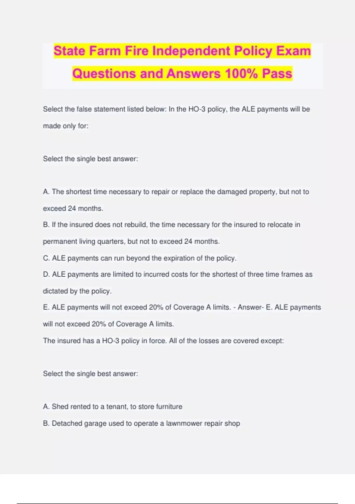 State Farm Fire Independent Policy Exam Questions and Answers 100% Pass Select the false statement listed below: In the HO-3 policy, the ALE payments will be made only for: Select the single best answer: A. The shortest time necessary to repair or replace the damaged property, but not to exceed 24 months. B. If the insured does not rebuild, the time necessary for the insured to relocate in permanent living quarters, but not to exceed 24 months. C. ALE payments can run beyond the expiration of the policy. D. ALE payments are limited to incurred costs for the shortest of three time frames as dictated by the policy. E. ALE payments will not exceed 20% of Coverage A limits. - Answer- E. ALE payments will not exceed 20% of Coverage A limits. The insured has a HO-3 policy in force. All of the losses are covered except: Select the single best answer: A. Shed rented to a tenant, to store furniture B. Detached garage used to operate a lawnmower repair shop C. Garage rented to the neighbor to store an antique automobile D. Basement used as an office for insured's bookkeeping business E. Garage (attached) rented to tenant to store fishing boat - Answer- B. Detached garage used to operate a lawnmower repair shop Jennifer Marco has a HO-3 policy, with a Coverage B limit of $75,000, a $500 deductible, and no Option AI, ID, FA or JF. Which of the following statements is true concerning her personal property? Select the single best answer: A. Coverage for personal property applies for perils listed under Section I - Losses Insured, Coverage B - Personal Property and Section I - Additional Coverages. B. Coverage B applies only for items Jennifer owns, while anywhere in the world. C. The limit of liability for theft loss to jewelry and furs is $1000 or 10% of the Coverage B limit, whichever is greater. D. The limit of liability for tornado losses to firearms is $2,500. - Answer- A. Coverage for personal property applies for perils listed under Section I - Losses Insured, Coverage B - Personal Property and Section I - Additional Coverages. Under an HO-3 policy, deductibles apply to which of the following type(s) of losses. Select the single best answer: A. Credit Card, Bank Fund Transfer Card, Forgery and Counterfeit Money B. Fire Department Service Charges C. Rekey locks after keys are stolen D. Debris Removal Charges - Answer- B. Fire Department Service Charges In the HO-3 policy, Coverage C consists of three coverages: Additional Living Expense Fair Rental Value Property Removed True or False - Answer- False its Additional Living expense, Fair rental value and prohibited use The steps in applying the deductible on a HO-3 homeowners policy are: 1.)The deductible is first applied to the covered loss. 2.)Any coverage or special limits are then applied to the covered loss. 3.)The amount payable to the insured will be the greater of the amounts arrived at in steps 1 and 2. True or False - Answer- True The definition of an insured includes all of the following except: Select the single best answer: A. Person(s) listed on the Declaration Page B. Spouse, if a resident of the household C. Relatives, if residents of the household D. Any person under the age of 21 in the care of the named insured, resident spouse, or a resident relative E. Spouse - Answer- Spouse Joe Smith has a HO-3 policy. He is a carpenter and has collected 100 2"X4" studs and 30 2"X6" rafters from various job sites. Joe has no specific plans to use the lumber. The lumber is covered under Coverage A. True or False - Answer- False Under an HO-3 policy, which of the following would be a Coverage B item? Select the single best answer: A. Satellite dish bolted to the eave of the house B. Free standing gas range C. Built-in microwave oven D. Automatic garage door opener E. Water softener system - Answer- Free Standing gas range Under an HO-3 policy, which of the following would not be a Coverage A item? Select the single best answer: A. Automatic lawn sprinkler system B. Wall to wall carpet attached to the dwelling C. A new (in the box), built-in microwave oven the insured intends to install in his fishing cabin. D. A shed, on a foundation, rented to a neighbor to store the neighbor's boat E. Materials and supplies to build bookshelves in the basement of the residence premises and stored in the garage - Answer- E. Materials and supplies to build bookshelves in the basement of the residence premises and stored in the garage An HO-3 homeowners policy with a $250 deductible is in force and the policy limits (Coverage A and Coverage B) are adequate to cover this damage. During a severe windstorm, rain blows through open windows and causes the following damage: Hardwood floor in the dining room $1,700 Water stains on the drywall $ 220 Water stains on the area rug $125 Antique vase (broken by force of wind) $375 How much should you pay on this loss? All repairs have been made. Select the single best answer: A. $ 0 B. $1,920 C. $2,420 D. $2,170 E. $2,045 - Answer- 2170