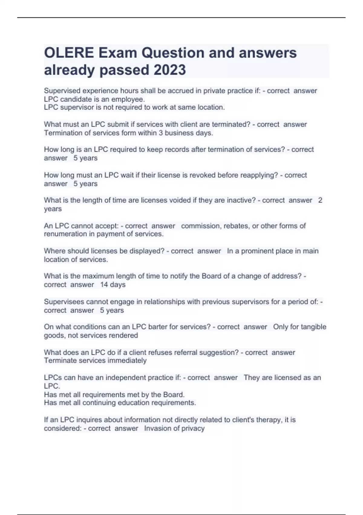 OLERE Exam Question and answers already passed 2023(updated)Licensed professional counselor" or "LPC" - correct answer any person who offers professional counseling services for compensation to any person and is licensed pursuant to the provisions of the Licensed Professional Counselors Act. Board - correct answer State Board of Behavioral Health Licensure Counseling - correct answer - facilitate human development and adjustment throughout the life span - prevent, diagnose or treat mental, emotional or behavioral disorders or associated distress which interfere with mental health - conduct assessments or diagnoses for the purpose of establishing treatment goals and objectives - plan, implement or evaluate treatment plans using counseling treatment interventions; Counseling treatment interventions - correct answer the application of cognitive, effective, behavioral and systemic counseling strategies which include principles of development, wellness, and pathology that reflect a pluralistic society. Such interventions are specifically implemented in the context of a professional counseling relationship Consulting - correct answer interpreting or reporting scientific fact or theory in counseling to provide assistance in solving current or potential problems of individuals, groups or organizations Referral activities - correct answer evaluating of data to identify problems and to determine the advisability of referral to other specialists Research activities - correct answer reporting, designing, conducting or consulting on research in counseling Specialty - correct answer designation of a subarea of counseling practice that is recognized by a national c
