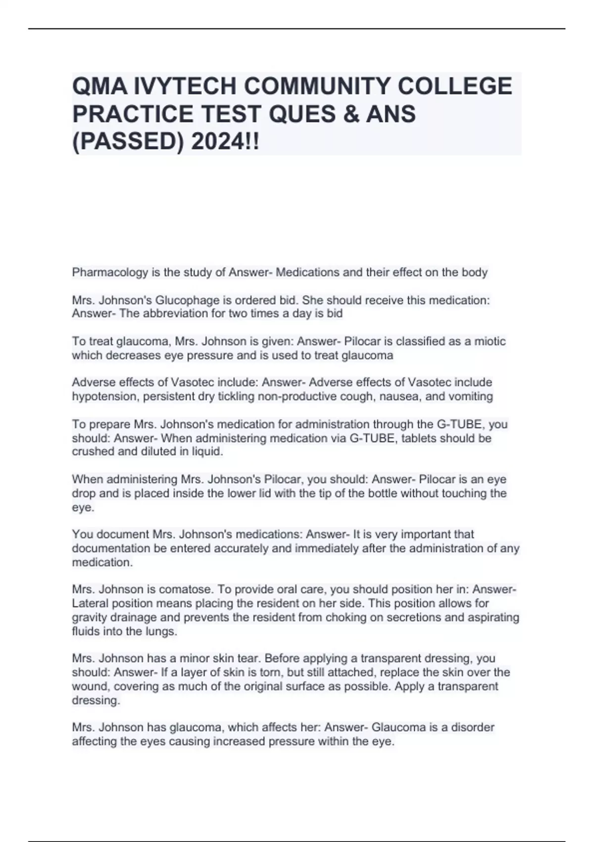 QMA IVYTECH COMMUNITY COLLEGE PRACTICE TEST QUES & ANS (PASSED) 2024!!