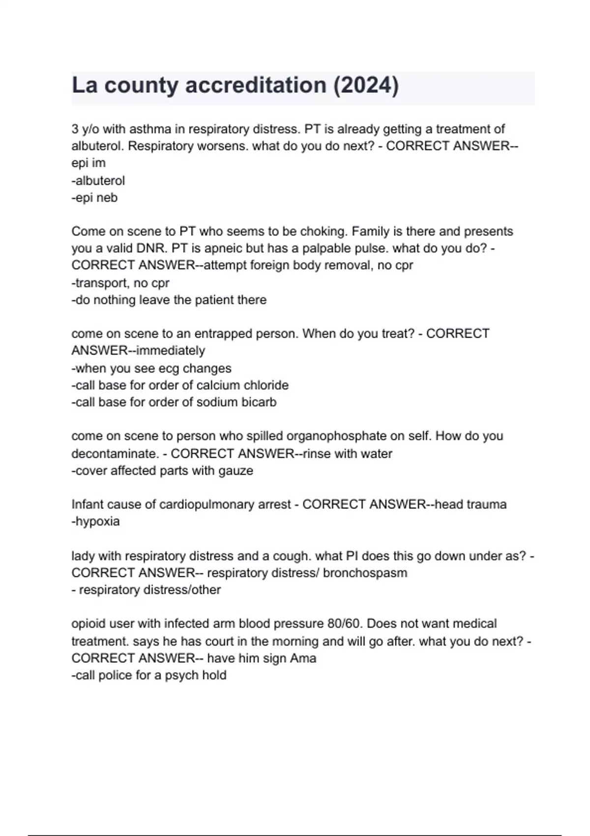 La county accreditation (2024) 3 y/o with asthma in respiratory distress. PT is already getting a treatment of albuterol. Respiratory worsens. what do you do next? - CORRECT ANSWER-- epi im -albuterol -epi neb Come on scene to PT who seems to be choking. Family is there and presents you a valid DNR. PT is apneic but has a palpable pulse. what do you do? - CORRECT ANSWER--attempt foreign body removal, no cpr -transport, no cpr -do nothing leave the patient there come on scene to an entrapped person. When do you treat? - CORRECT ANSWER--immediately -when you see ecg changes -call base for order of calcium chloride -call base for order of sodium bicarb come on scene to person who spilled organophosphate on self. How do you decontaminate. - CORRECT ANSWER--rinse with water -cover affected parts with gauze Infant caus