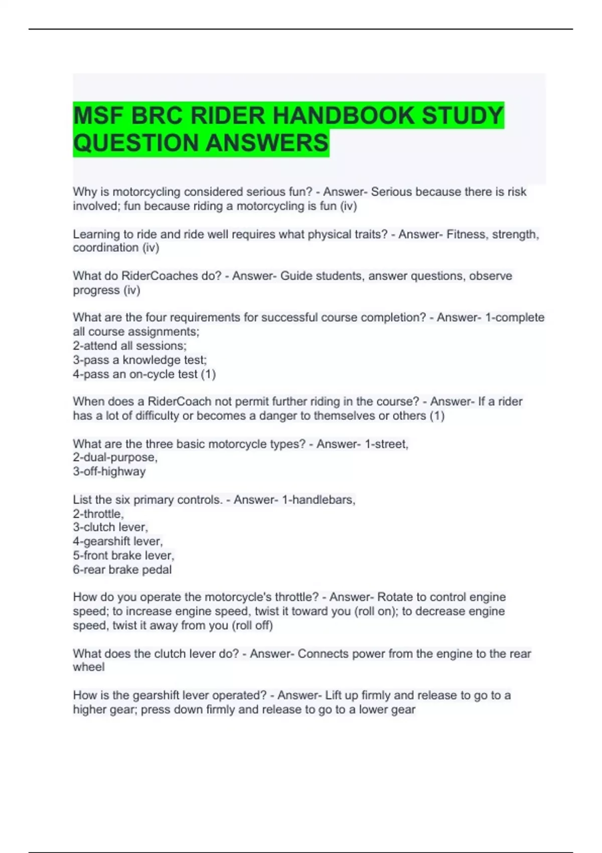 MSF BRC RIDER HANDBOOK STUDY QUESTION ANSWERS- GRADED A