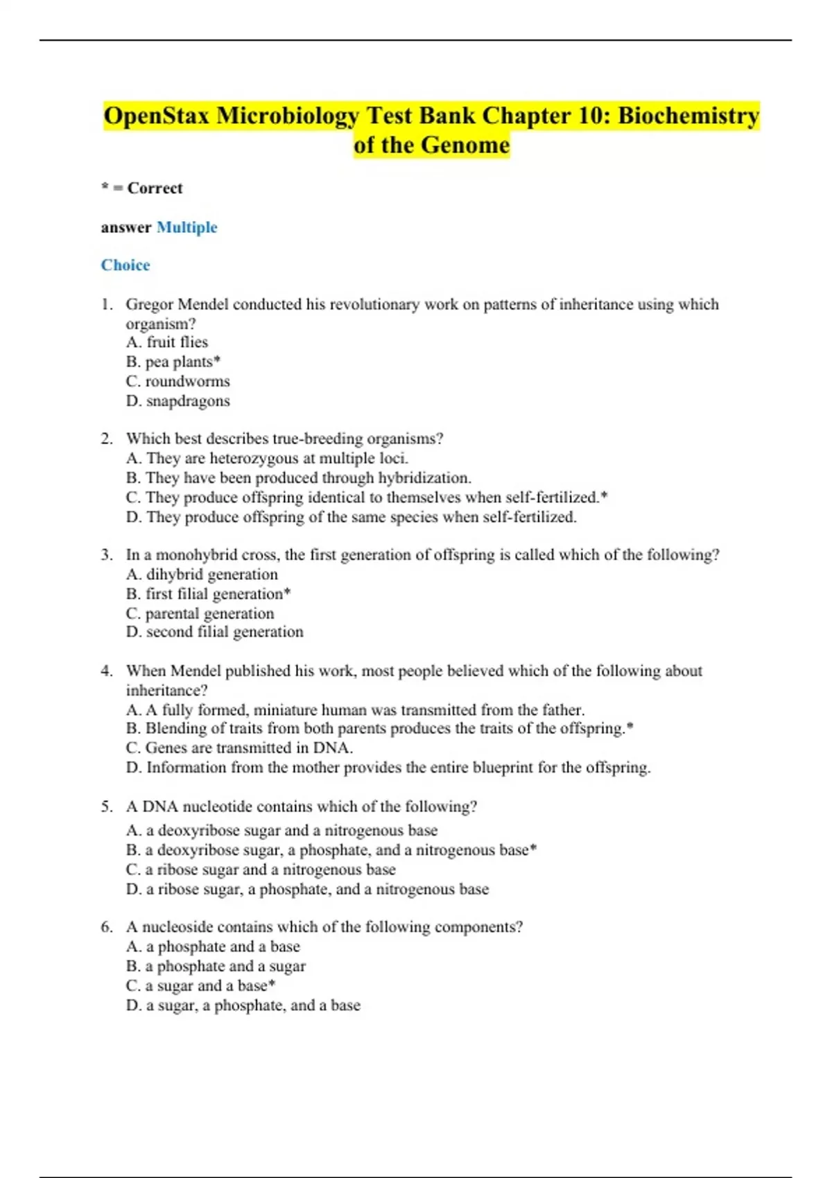 OpenStax Microbiology Test Bank Chapter 10: Biochemistry of the Genome * = Correct answer Multiple Choice 1.Gregor Mendel conducted his revolutionary work on patterns of inheritance using which organism? A.fruit flies B.pea plants* C.roundworms D.snapdragons 2.Which best describes true-breeding organisms? A.They are heterozygous at multiple loci. B.They have been produced through hybridization. C.They produce offspring identical to themselves when self-fertilized.* D.They produce offspring of the same species when self-fertilized. 3.In a monohybrid cross, the first generation of offspring is called which of the following? A.dihybrid generation B.first filial generation* C.parental generation D.second filial generation 4.When Mendel published his work, most people believed which of the following about inheritance? A.A fully formed, miniature human was transmitted from the father. B.Blending of traits from both parents produces the traits of the offspring.* C.Genes are transmitted in DNA. D.Information from the mother provides the entire blueprint for the offspring. 5.A DNA nucleotide contains which of the following? A.a deoxyribose sugar and a nitrogenous base B.a deoxyribose sugar, a phosphate, and a nitrogenous base* C.a ribose sugar and a nitrogenous base D.a ribose sugar, a phosphate, and a nitrogenous base 6.A nucleoside contains which of the following components? A.a phosphate and a base B.a phosphate and a sugar C.a sugar and a base* D.a sugar, a phosphate, and a base 7.Which of the following is a name for nitrogenous bases with a double-ring structure? A.nucleosides B.nucleotides C.purines* D.pyrimidines 8.Where in the DNA structure do DNA-binding proteins generally bind? A.in the center of the helix, between the bases B.in the major grooves C.in the minor grooves D.in the major and minor grooves* 9.Which of the following is not an example of an organism’s phenotype? A.a behavioral response to certain conditions B.an organism’s observable characteristics C.the DNA sequence of a cellular genome* D.which enzymes are being synthesized 10.Who identified the nucleotide bases of DNA and RNA? A.Richard Altmann B.Albrecht Kossel* C.Gregor Mendel D.Friedrich Miescher 11.Mendel published his work in which of the following books? A.Experiments in Plant Hybridization* B.On the Origin of Species C.The Double Helix D.The Physical Basis of Heredity 12.Whose work provided the first experimental evidence for the Chromosomal Theory of Inheritance? A.Theodor Boveri’s work with sea urchins B.Barbara McClintock’s work with maize C.Gregor Mendel’s work with pea plants D.Thomas Hunt Morgan’s work with Drosophila* 13.Which alga provided an important model to demonstrate the location of genetic information in the nucleus? A.Acetabularia* B.Chlamydomonas C.Ulva D.Volvox 14.The one gene–one enzyme hypothesis that developed into the one gene–one polypeptide hypothesis was proposed by which of the following? A.George Beadle, Edward Tatum, and colleagues* B.Gregor Mendel C.Matthew Meselson and Franklin Stahl D.Thomas Hunt Morgan 15.Evidence that DNA was the genetic material rather than protein was provided by which of the following? A.Oswald Avery, Colin MacLeod, and Maclyn McCarty B.George Beadle, Edward Tatum, and colleagues C.Alfred Hershey and Martha Chase* D.Matthew Meselson and Franklin Stahl 16.Who first demonstrated horizontal transmission of genetic information? A.Oswald Avery B.Frederick Griffith* C.Barbara McClintock D.Thomas Hunt Morgan 17.Which of the following correctly describes the number and type of bond(s) that stabilize an adenine–thymine base pair? A.one hydrogen bond B.one phosphodiester bond C.two hydrogen bonds* D.three hydrogen bonds 18.Which of the following describes the relationship in which the amount of adenine equals the amount of thymine, and the amount of guanine equals the amount of cytosine in double- stranded DNA? A.Chargaff’s rules* B.Griffith’s rules C.Mendel’s laws D.Pauling’s principles 19.Which researchers published the first description of DNA as a double helix? A.Francis Crick and Linus Pauling B.Rosalind Franklin and Linus Pauling C.Rosalind Franklin and Maurice Wilkins D.James Watson and Francis Crick* 20.Which researcher produced X-ray diffraction images of DNA that were critical to determining its structure but did not receive a Nobel prize with colleagues because it is not awarded posthumously? A.Francis Crick B.Rosalind Franklin* C.James Watson D.Maurice Wilkins 21.One strand of DNA runs from 5′ to 3′ and the opposing strand runs 3′ to 5′, meaning that the strands are oriented in which way? A.antiparallel* B.conservative C.helical D.semiconservative 22.The rejoining of two previously separated strands of DNA is called which of the following? A.denaturation B.hydrogenation C.reannealing* D.semiconservative replication 23.DNA strands are often denatured in the laboratory using which method? A.adding restriction enzymes B.freezing the sample C.raising the temperature* D.using a cold calcium chloride solution 24.Transmission of genetic information from parent to offspring is called which of the following? A.horizontal gene transfer B.phage transfer C.transposition D.vertical gene transfer* 25.Which of the following is not a difference between DNA and RNA? A.DNA is used for shorter-term functions than RNA.* B.DNA is usually double stranded and RNA is usually single stranded. C.RNA contains uracil and DNA contains thymine. D.RNA is usually less stable than DNA. 26.Which process produces an RNA copy of a DNA molecule? A.replication B.transcription* C.transformation D.translation 27.In which cellular location in a eukaryote do rRNA synthesis and ribosome assembly occur? A.at ribosomes attached to the rough endoplasmic reticulum B.in the cytoplasm C.in the nucleolus* D.in the pores of the nuclear envelope