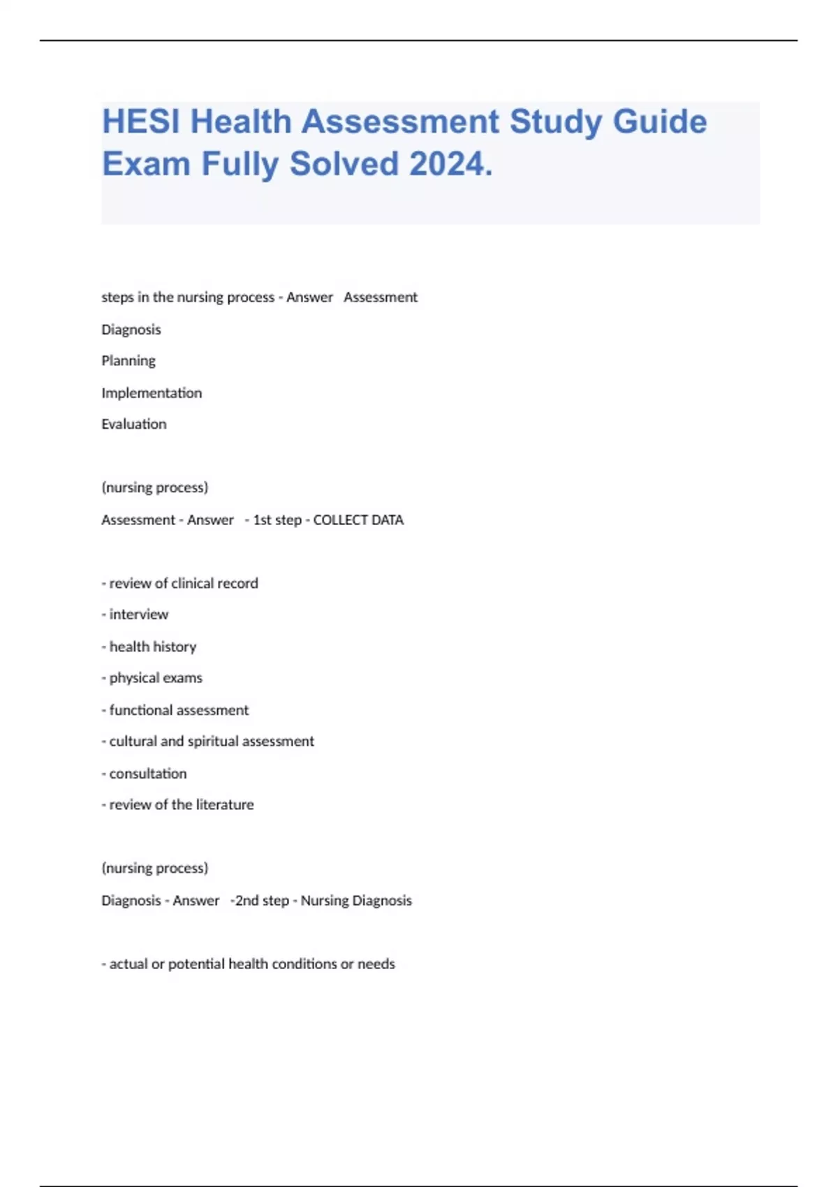 steps in the nursing process - Answer Assessment Diagnosis Planning Implementation Evaluation (nursing process) Assessment - Answer - 1st step - COLLECT DATA - review of clinical record - interview - health history - physical exams - functional assessment - cultural and spiritual assessment - consultation - review of the literature (nursing process) Diagnosis - Answer -2nd step - Nursing Diagnosis - actual or potential health conditions or needs