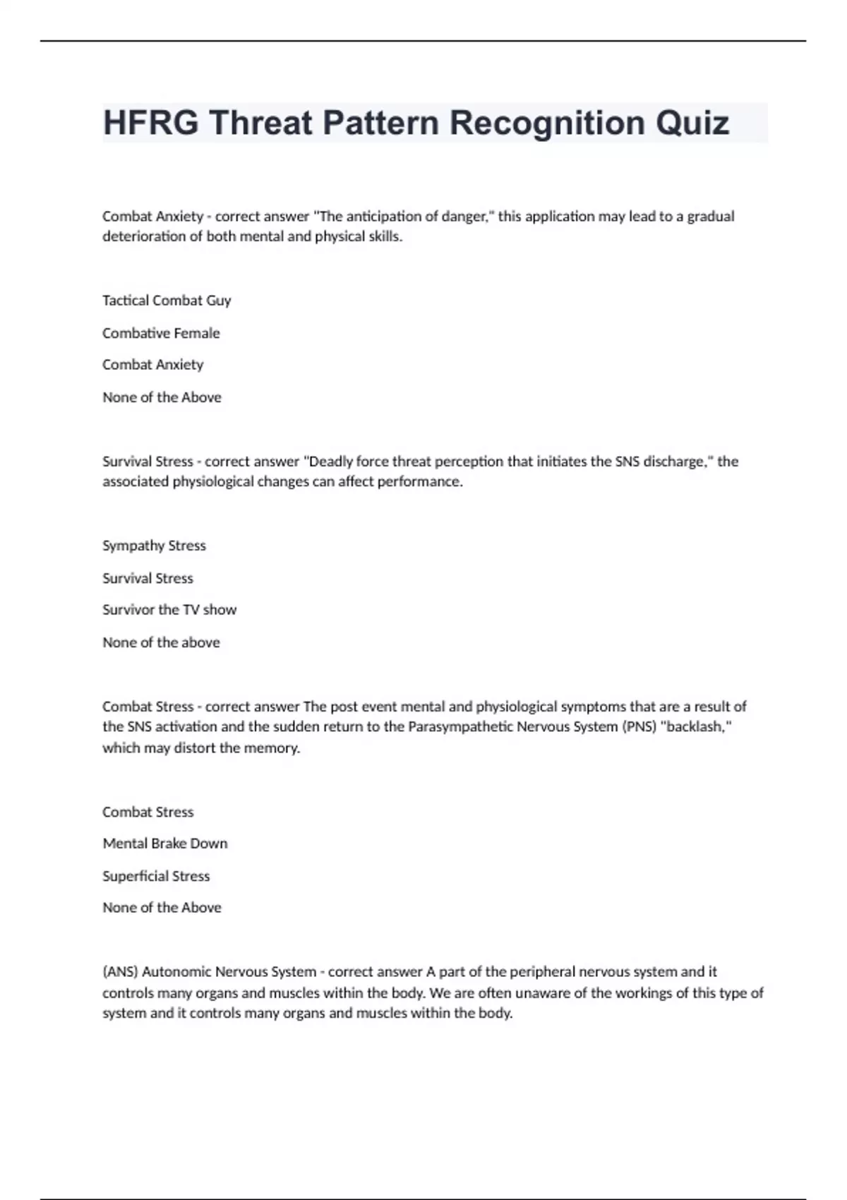 HFRG Threat Pattern Recognition Quiz and answers correctly solved 2024 Combat Anxiety - correct answer "The anticipation of danger," this application may lead to a gradual deterioration of both mental and physical skills. Tactical Combat Guy Combative Female Combat Anxiety None of the Above Survival Stress - correct answer "Deadly force threat perception that initiates the SNS discharge," the associated physiological changes can affect performance. Sympathy Stress Survival Stress Survivor the TV show None of the above Combat Stress - correct answer The post event mental and physiological symptoms that are a result of the SNS activation and the sudden return to the Parasympathetic Nervous System (PNS) "backlash," which may distort the memory. Combat Stress Mental Brake Down Superficial Stress None of the Above (ANS) Autonomic Nervous System - correct answer A part of the peripheral nervous system and it controls many organs and muscles within the body. We are often unaware of the workings of this type of system and it controls