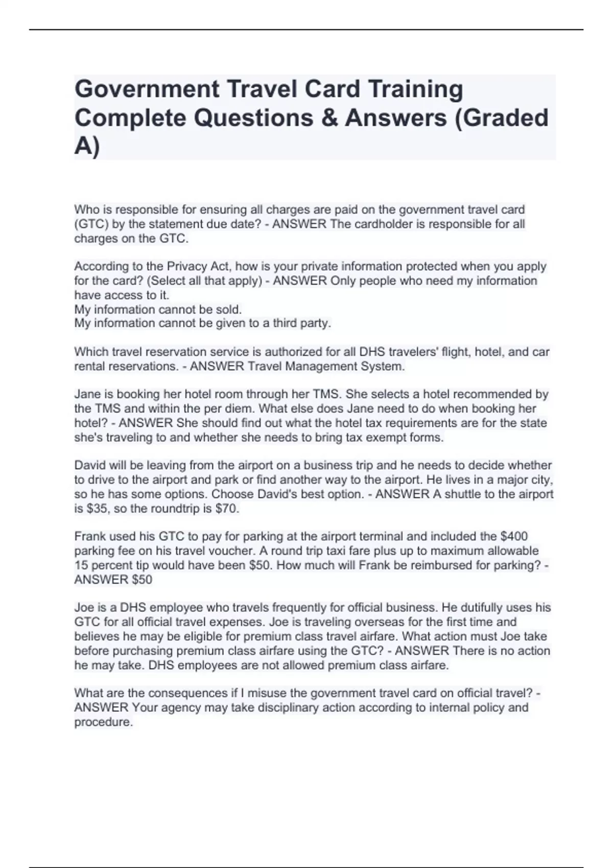 Government Travel Card Training Complete Questions & Answers (Graded A)Government Travel Card Training Complete Questions & Answers (Graded A)Government Travel Card Training Complete Questions & Answers (Graded A)Government Travel Card Training Complete Questions & Answers (Graded A) Who is responsible for ensuring all charges are paid on the government travel card (GTC) by the statement due date? - ANSWER The cardholder is responsible for all charges on the GTC. According to the Privacy Act, how is your private information protected when you apply for the card? (Select all that apply) - ANSWER Only people who need my information