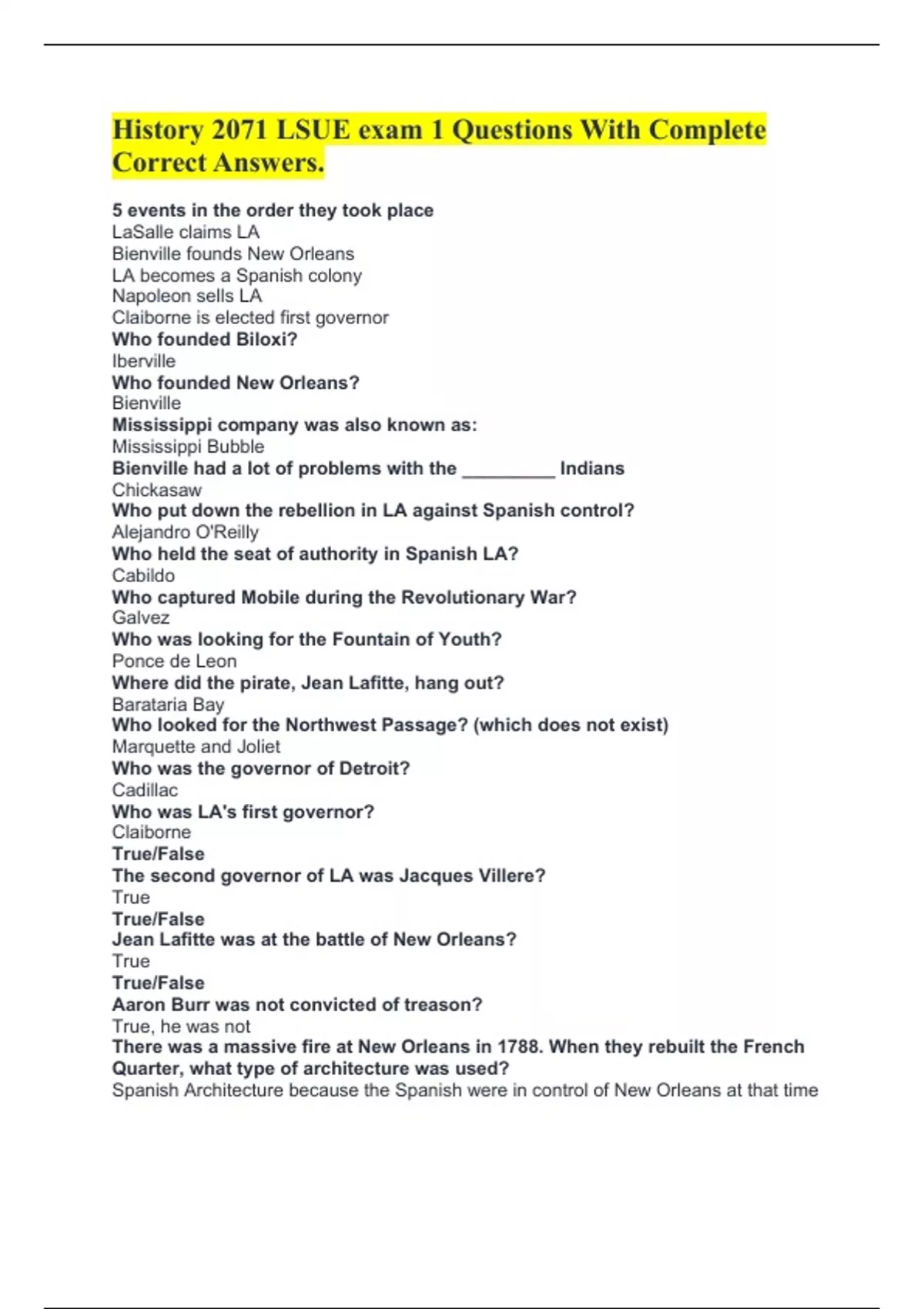 History 2071 LSUE exam 1 Questions With Complete Correct Answers. 5 events in the order they took place LaSalle claims LA Bienville founds New Orleans LA becomes a Spanish colony Napoleon sells LA Claiborne is elected first governor Who founded Biloxi? Iberville Who founded New Orleans? Bienville Mississippi company was also known as: Mississippi Bubble Bienville had a lot of problems with the _________ Indians Chickasaw Who put down the rebellion in LA against Spanish control? Alejandro O'Reilly Who held the seat of authority in Spanish LA? Cabildo Who captured Mobile during the Revolutionary War? Galvez Who was looking for the Fountain of Youth? Ponce de Leon Where did the pirate, Jean Lafitte, hang out? Barataria Bay Who looked for the Northwest Passage? (which does not exist) Marquette and Joliet Who was the governor of Detroit? Cadillac Who was LA's first governor? Claiborne True/False The second governor of LA was Jacques Villere? True True/False Jean Lafitte was at the battle of New Orleans? True True/False Aaron Burr was not convicted of treason? True, he was not There was a massive fire at New Orleans in 1788. When they rebuilt the French Quarter, what type of architecture was used? Spanish Architecture because the Spanish were in control of New Orleans at that time