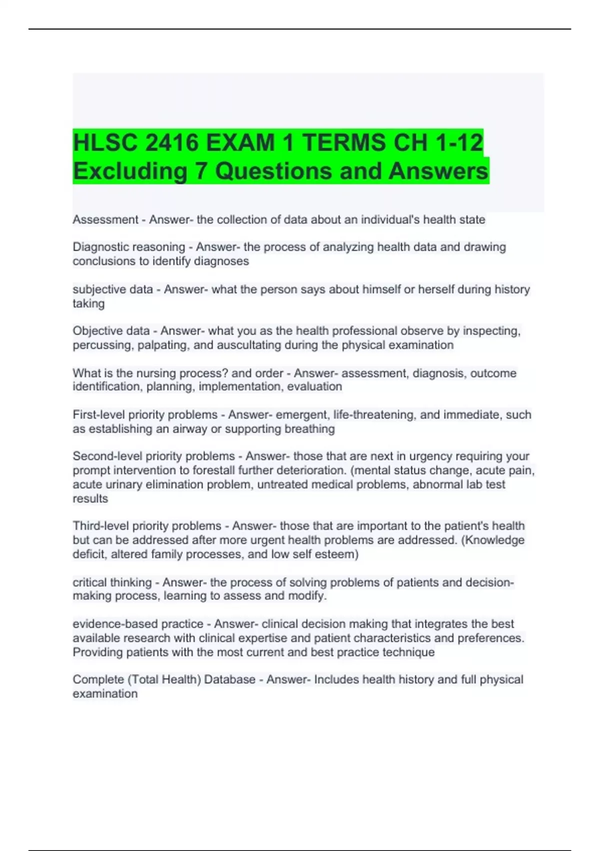HLSC 2416 EXAM 1 TERMS CH 1-12 Excluding 7 Questions and Answers