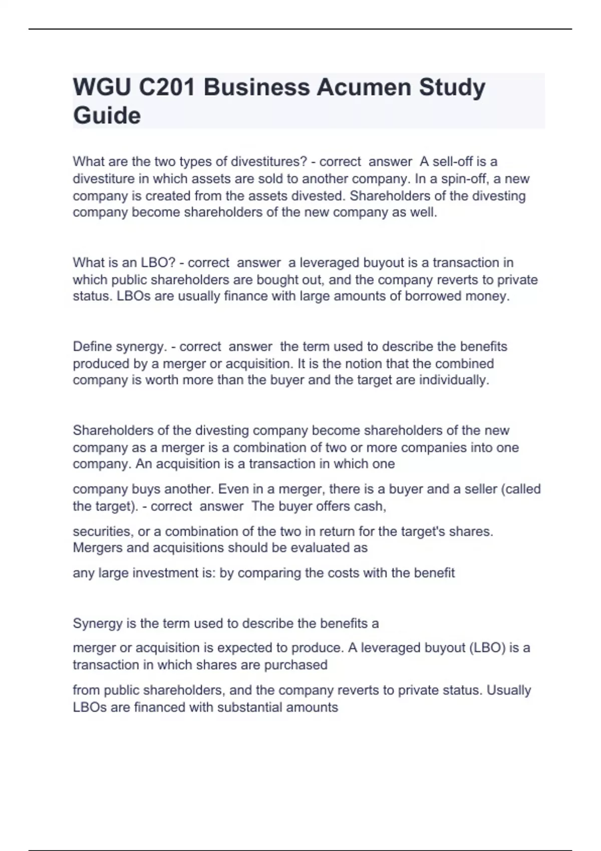 WGU C201 Business Acumen Study Guide Question and answers correctly solved 2024 What are the two types of divestitures? - correct answer A sell-off is a divestiture in which assets are sold to another company. In a spin-off, a new company is created from the assets divested. Shareholders of the divesting company become shareholders of the new company as well. What is an LBO? - correct answer a leveraged buyout is a transaction in which public shareholders are bought out, and the company reverts to private status. LBOs are usually finance with large amounts of borrowed money. Define synergy. - correct answer the term used to describe the benefits produced by a merger or acquisition. It is the notion that the combined company is worth more than the buyer and the target are individually. Shareholders of the divesting company become shareholders of the new company as a merger is a combination of two or more companies into one company. An acquisition is a transaction in which one company buys another. Even in a merger, there is a buyer and a seller (called the target). - correct answer The buyer offers cash, securities, or a combination of the two in return for the target's shares. Mergers and acquisitions should be evaluated as any large investment is: by comparing the costs with the benefit Synergy is the term used to describe the benefits a merger or acquisition is expected to produce. A leveraged buyout (LBO) is a transaction in which shares are purchased from public shareholders, and the company reverts to private status. Usually LBOs are financed with substantial amounts of borrowed funds. Private equity companies are often major financers of LBOs. - correct answer Divestitures are the opposite of mergers, in which companies sell assets such as subsidiaries, product lines, or production facilities. A sell-off is a divestiture in which assets are