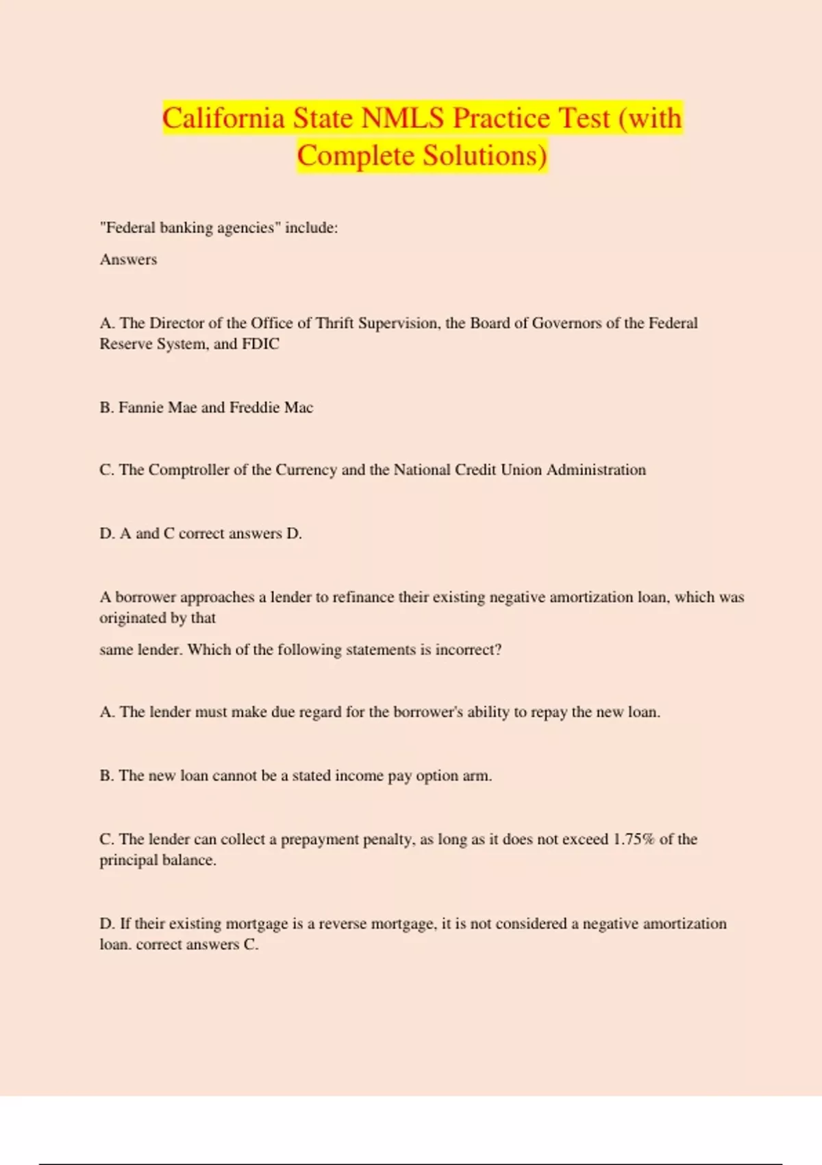 Federal banking agencies" include: Answers A. The Director of the Office of Thrift Supervision, the Board of Governors of the Federal Reserve System, and FDIC B. Fannie Mae and Freddie Mac C. The Comptroller of the Currency and the National Credit Union Administration D. A and C correct answers D. A borrower approaches a lender to refinance their existing negative amortization loan, which was originated by that same lender. Which of the following statements is incorrect?