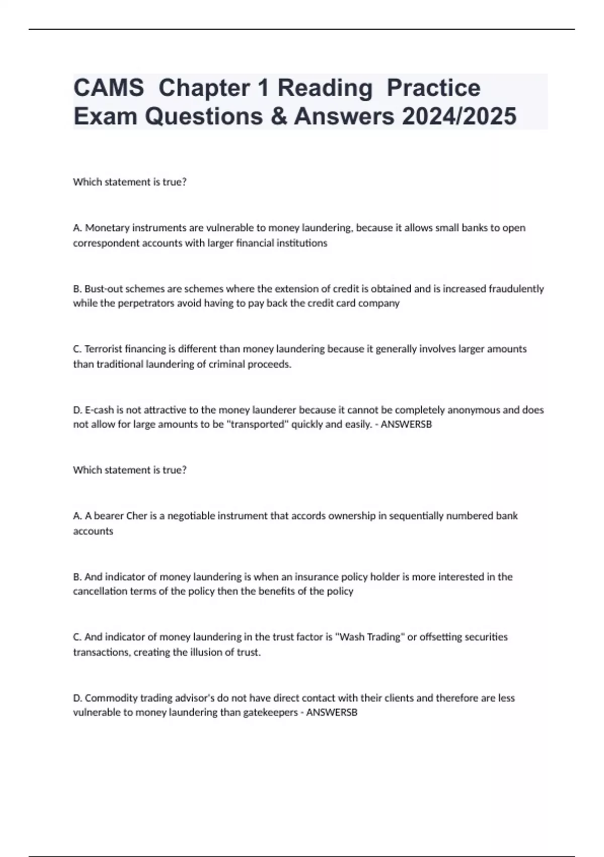 CAMS Chapter 1 Reading Practice Exam Questions & Answers 2024/2025 Which statement is true? A. Monetary instruments are vulnerable to money laundering, because it allows small banks to open correspondent accounts with larger financial institutions B. Bust-out schemes are schemes where the extension of credit is obtained and is increased fraudulently while the perpetrators avoid having to pay back the credit card company C. Terrorist financing is different than money laundering because it generally involves larger amounts than traditional laundering of criminal proceeds. D. E-cash is not attractive to the money launderer because it cannot be completely anonymous and does not allow for large amounts to be "transported" quickly and easily. - ANSWERSB Which statement is true? A. A bearer Cher is a negotiable instrument that accords ownership in sequentially numbered bank accounts B. And indicator of money laundering is when an insurance policy holder is more interested in the cancellation terms of the policy then the benefits of the policy C. And indicator of money laundering in the trust factor is "Wash Trading" or offsetting securities transactions, creating the illusion of trust. D. Commodity trading advisor's do not have direct contact with their clients and therefore are less vulnerable to money laundering than gatekeepers - ANSWERSB