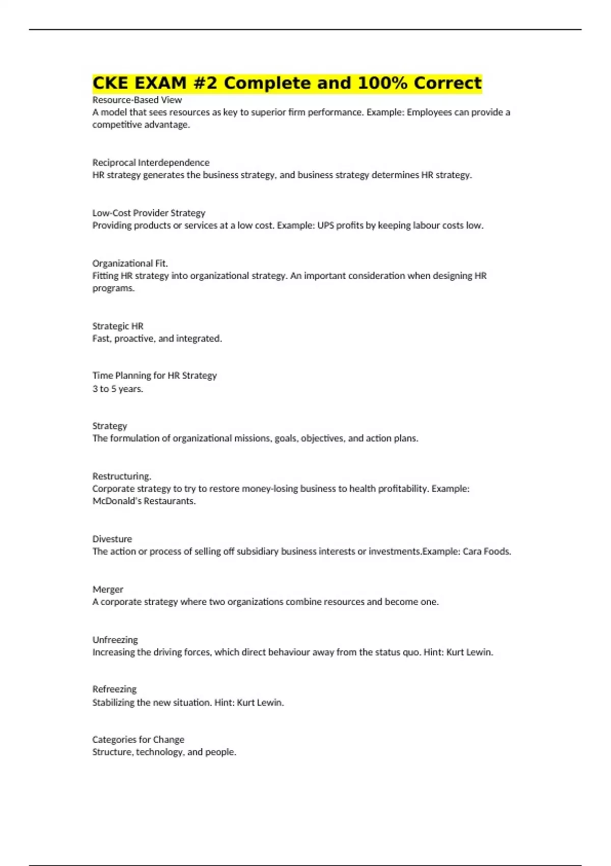 CKE EXAM #2 Complete and 100% Correct Resource-Based View A model that sees resources as key to superior firm performance. Example: Employees can provide a competitive advantage. Reciprocal Interdependence HR strategy generates the business strategy, and business strategy determines HR strategy. Low-Cost Provider Strategy Providing products or services at a low cost. Example: UPS profits by keeping labour costs low. Organizational Fit. Fitting HR strategy into organizational strategy. An important consideration when designing HR programs. Strategic HR Fast, proactive, and integrated. Time Planning for HR Strategy 3 to 5 years. Strategy The formulation of organizational missions, goals, objectives, and action plans. Restructuring. Corporate strategy to try to restore money-losing business to health profitability. Example: McDonald's Restaurants. Divesture The action or process of selling off subsidiary business interests or investments.Example: Cara Foods. Merger A corporate strategy where two organizations combine resources and become one. Unfreezing Increasing the driving forces, which direct behaviour away from the status quo. Hint: Kurt Lewin. Refreezing Stabilizing the new situation. Hint: Kurt Lewin. Categories for Change Structure, technology, and people.
