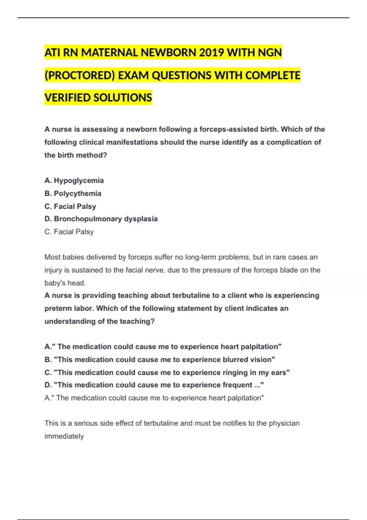 ATI RN MATERNAL NEWBORN 2019 WITH NGN (PROCTORED) EXAM QUESTIONS WITH COMPLETE VERIFIED SOLUTIONS A nurse is assessing a newborn following a forceps-assisted birth. Which of the following clinical manifestations should the nurse identify as a complication of the birth method? A. Hypoglycemia B. Polycythemia C. Facial Palsy D. Bronchopulmonary dysplasia C. Facial Palsy Most babies delivered by forceps suffer no long-term problems, but in rare cases an injury is sustained to the facial nerve, due to the pressure of the forceps blade on the baby's head. A nurse is providing teaching about terbutaline to a client who is experiencing preterm labor. Which of the following statement by client indicates an understanding of the teaching? A." The medication could cause me to experience heart palpitation" B. "This medication could cause me to experience blurred vision" C. "This medication could cause me to experience ringing in my ears" D. "This medication could cause me to experience frequent ..." A." The medication could cause me to experience heart palpitation" This is a serious side effect of terbutaline and must be notifies to the physician immediately A nurse is caring for a client who has hyperemesis gravidarum. Which of the following laboratory tests should the nurse anticipate? A . Urine Ketones B. Rapid plasma regain C.Prothrombin time D.Urine culture Urine Ketones Hyperemesis gravidarum is a severe form of this 'morning sickness', experience by less than 1% of pregnant women. It can cause dehydration and starvation and the production of compounds called ketones that can be found in the blood and urine. A nurse is caring for a client who is in labor and requests nonpharmacological pain management. Which of the following nursing actions promotes client comfort? A. Assisting the client into squatting position B. Having the client lie in a supine position C. Applying fundal pressure during contractions D. Encouraging the client to void every 6 hr Having the client lie in a supine position Having the patient lie in a comfortable position may help reduce sensation of pain due to labor A nurse caring for a client who is at 20 weeks of gestation and has trichomoniasis. Which of the following findings should the nurse expect? A. Thick, White Vaginal Discharge B. Urinary Frequency C. Vulva Lesions D. Malodorous Discharge Malodorous Discharge A nurse is caring for a client who is 14 weeks of gestation. At which the following locations should the nurse place the Doppler device when assessing the fetal heart rate? A . Midline 2 to 3 cm (0.8 to 1.2 in) above the symphysis pubis B. Left Upper Abdomen C. Two fingerbreadths above the umbilicus D. Lateral at the Xiphoid Process Midline 2 to 3 cm (0.8 to 1.2 in) above the symphysis pubis at 14 weeks AOG this is where to place the doppler probe to note