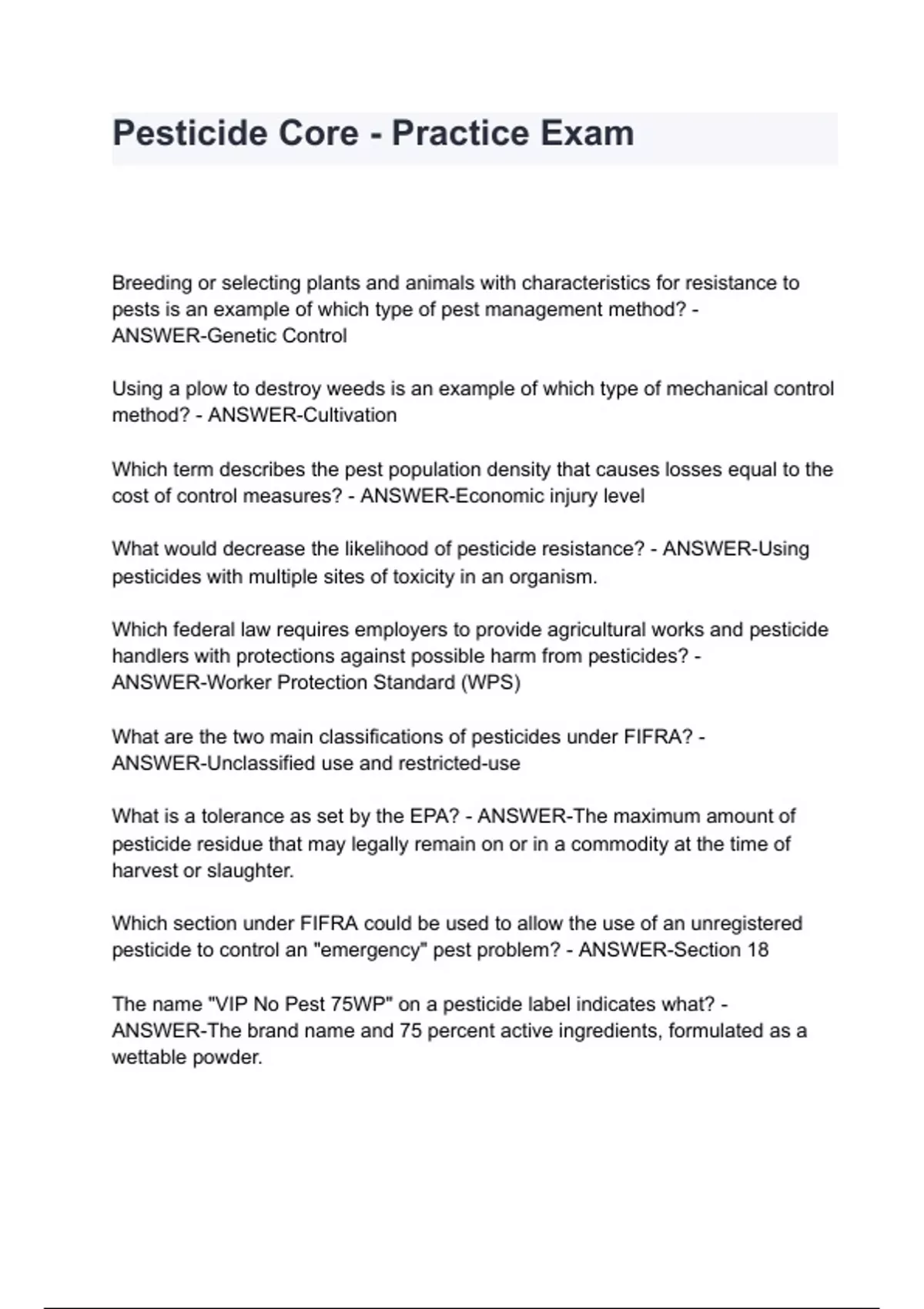 Pesticide Core - Practice Exam with complete solution