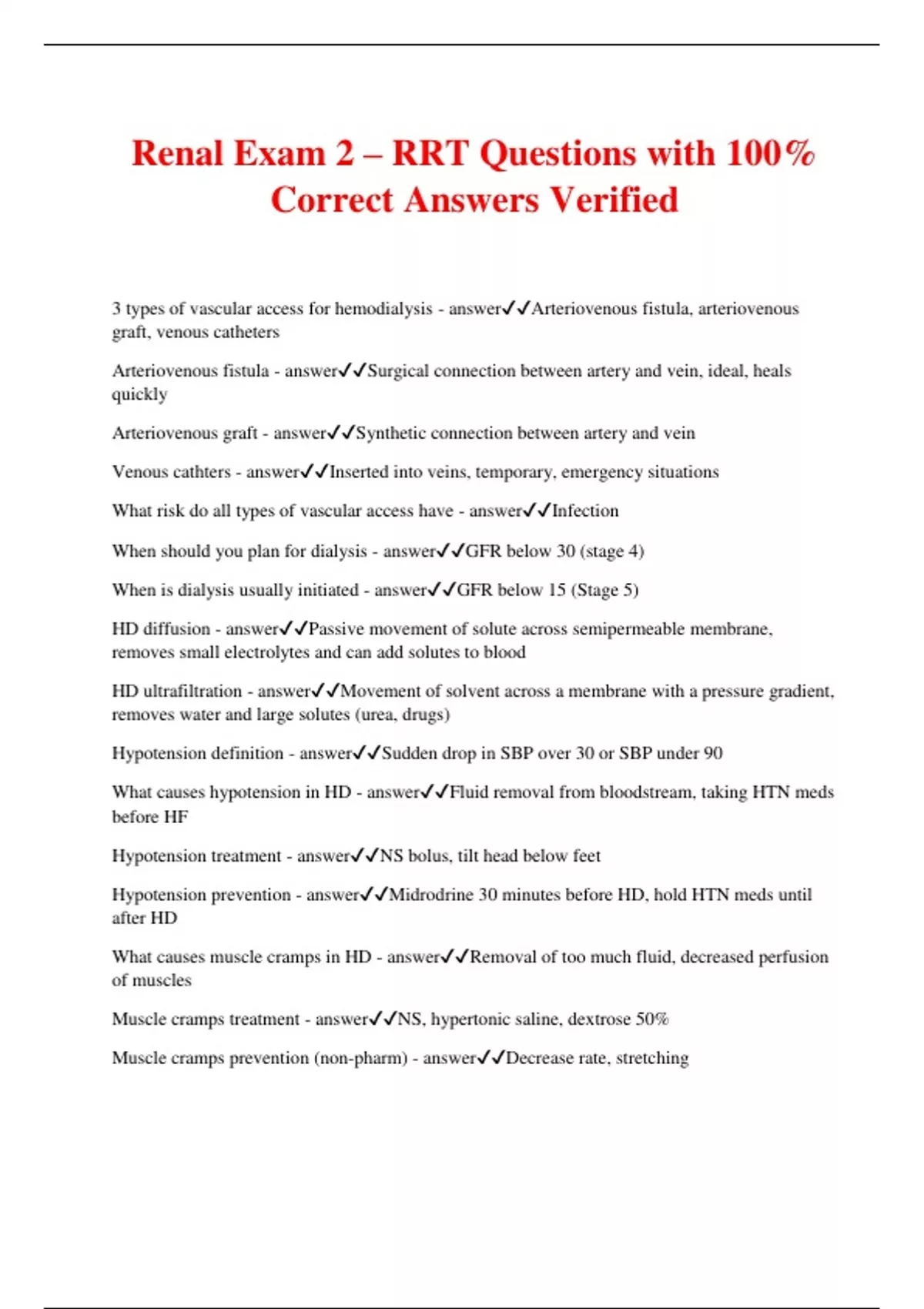 Renal Exam 2 – RRT Questions with 100% Correct Answers Verified 3 types of vascular access for hemodialysis - answerArteriovenous fistula, arteriovenous graft, venous catheters Arteriovenous fistula - answerSurgical connection between artery and vein, ideal, heals quickly Arteriovenous graft - answerSynthetic connection between artery and vein Venous cathters - answerInserted into veins, temporary, emergency situations What risk do all types of vascular access have - answerInfection When should you plan for dialysis - answerGFR below 30 (stage 4) When is dialysis usually initiated - answerGFR below 15 (Stage 5) HD diffusion - answerPassive movement of solute across semipermeable membrane, removes small electrolytes and can add solutes to blood HD ultrafiltration - answerMovement of solvent across a membrane with a pressure gradient, removes water and large solutes (urea, drugs) Hypotension definition - answerSudden drop in SBP over 30 or SBP under 90 What causes hypotension in HD - answerFluid removal from bloodstream, taking HTN meds before HF Hypotension treatment - answerNS bolus, tilt head below feet Hypotension prevention - answerMidrodrine 30 minutes before HD, hold HTN meds until after HD What causes muscle cramps in HD - answerRemoval of too much fluid, decreased perfusion of muscles Muscle cramps treatment - answerNS, hypertonic saline, dextrose 50% Muscle cramps prevention (non-pharm) - answerDecrease rate, stretching