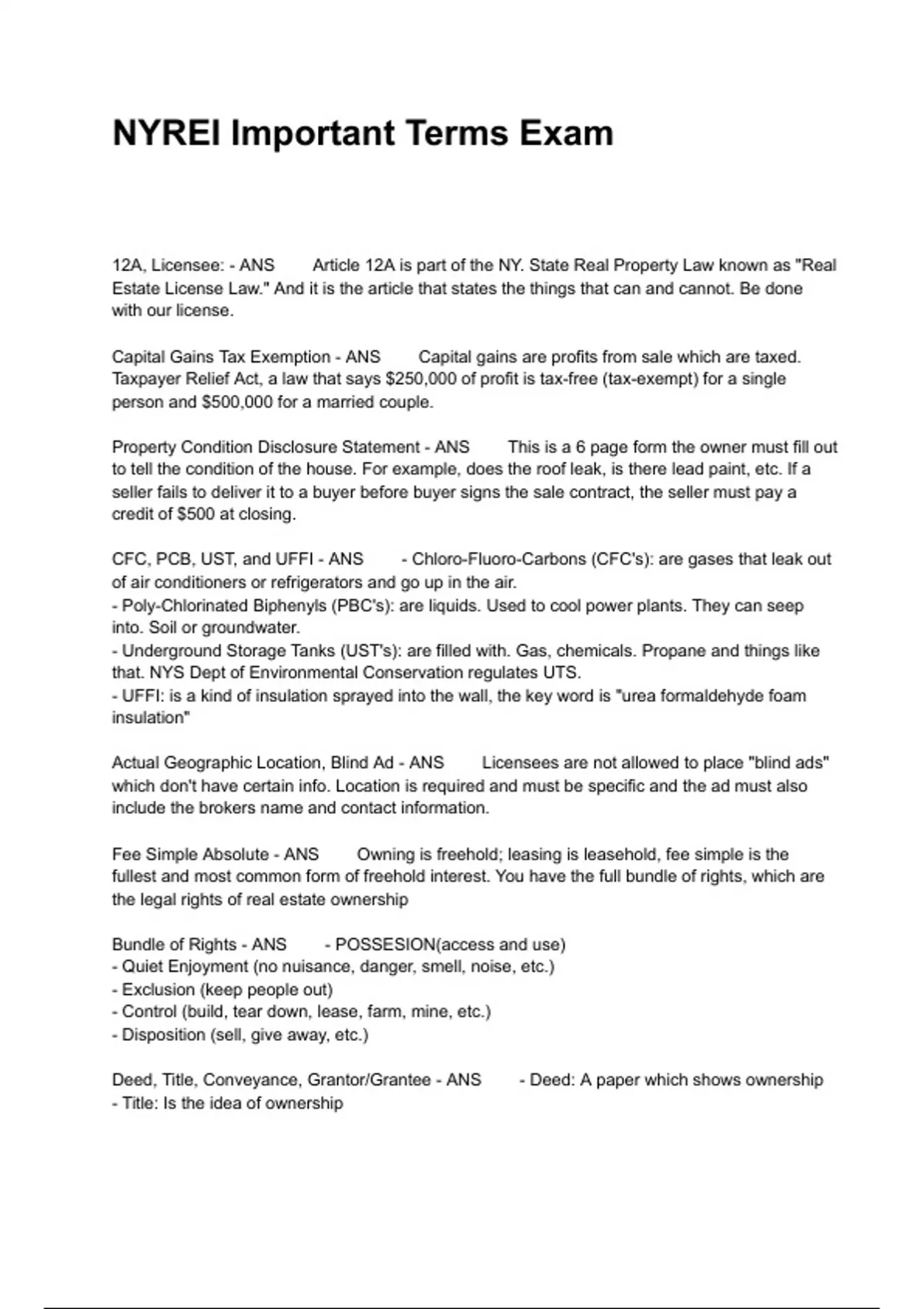 12A, Licensee: - ANS Article 12A is part of the NY. State Real Property Law known as "Real Estate License Law." And it is the article that states the things that can and cannot. Be done with our license. Capital Gains Tax Exemption - ANS Capital gains are profits from sale which are taxed. Taxpayer Relief Act, a law that says $250,000 of profit is tax-free (tax-exempt) for a single person and $500,000 for a married couple. Property Condition Disclosure Statement - ANS This is a 6 page form the owner must fill out to tell the condition of the house. For example, does the roof leak, is there lead paint, etc. If a seller fails to deliver it to a buyer before buyer signs the sale contract, the seller must pay a credit of $500 at closing. CFC, PCB, UST, and UFFI - ANS - Chloro-Fluoro-Carbons (CFC's): are gases that leak out of air conditioners or refrigerators and go up in the air. - Poly-Chlorinated Biphenyls (PBC's): are liquids. Used to cool power plants. They can seep into. Soil or groundwater. - Underground Storage Tanks (UST's): are filled with. Gas, chemicals. Propane and things like that. NYS Dept of Environmental Conservation regulates UTS. - UFFI: is a kind of insulation sprayed into the wall, the key word is "urea formaldehyde foam insulation" Actual Geographic Location, Blind Ad - ANS Licensees are not allowed to place "blind ads" which don't have certain info. Location is required and must be specific and the ad must also include the brokers name and contact information. Fee Simple Absolute - ANS Owning is freehold; leasing is leasehold, fee simple is the fullest and most common form of freehold interest. You have the full bundle of rights, which are the legal rights of real estate ownership Bundle of Rights - ANS - POSSESION(access and use) - Quiet Enjoyment (no nuisance, danger, smell, noise, etc.) - Exclusion (keep people out) - Control (build, tear down, lease, farm, mine, etc.) - Disposition (sell, give away, etc.) Deed, Title, Conveyance, Grantor/Grantee - ANS - Deed: A paper which shows ownership - Title: Is the idea of ownership - Conveyance: is the transfer of title by deed - Grantor: Person giving up the real estate (seller) - Grantee: the person getting the real estate Deed is signed by ALL GRANTORS Assignment, Sublease, Novation - ANS - Assignment: is when a tenant has to break a lease and assigns the lease to a new tenant who will have the same lease terms - Subleases: is when a tenant who leaves town leases the apartment to a new tenant or a sub lessee - Novation: Is when a new contract takes the place of an old one (substituting a new contract for an old one so that a new party assumes an obligation that was incurred by the original party.) Federal Environmental Laws - ANS - Clean Air Act - Clean Water Act - Safe Drinking Water Act - CERCLA/ Superfund (Comprehensive Response, Compensation & Liability Act) Sheathing and Flashing - ANS - Sheathing is panels or sheets(often made of plywood or some prefab material ) that they put on the outside to keep rain out. Is nailed to wall studs or roof rafters on o