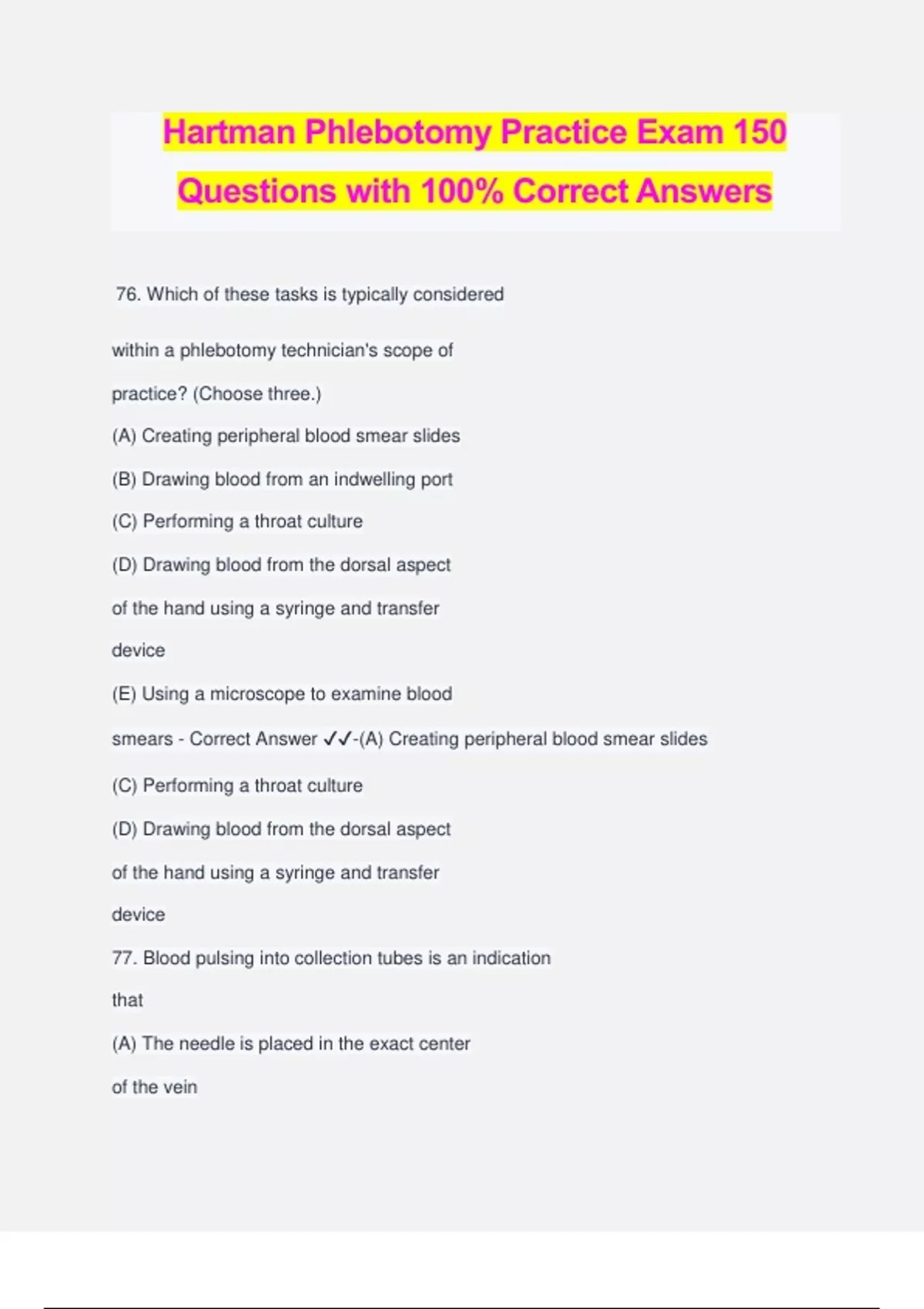 Hartman Phlebotomy Practice Exam 150 Questions with 100% Correct Answers 76. Which of these tasks is typically considered within a phlebotomy technician's scope of practice? (Choose three.) (A) Creating peripheral blood smear slides (B) Drawing blood from an indwelling port (C) Performing a throat culture (D) Drawing blood from the dorsal aspect of the hand using a syringe and transfer device (E) Using a microscope to examine blood smears - Correct Answer ️️ -(A) Creating peripheral blood smear slides (C) Performing a throat culture (D) Drawing blood from the dorsal aspect of the hand using a syringe and transfer device 77. Blood pulsing into collection tubes is an indication that (A) The needle is placed in the exact center of the vein (B) The needle has struck a nerve (C) The needle has passed entirely through the vein (D) The needle has struck an artery - Correct Answer ️️ -(D) The needle has struck an artery 78. A phlebotomist needs to collect gold, pink, and green-topped tubes by venipuncture. Which order is correct? (A) Gold, green, pink (B) Green, gold, pink (C) Pink, green, gold (D) Gold, pink, green - Correct Answer ️️ -(A) Gold, green, pink 79. Collection tubes with ___________________ _____________ should not be used for therapeutic drug testing. (A) Separator gel (B) Clot activator (C) Red tops (D) Internal vacuum - Correct Answer ️️ -(A) Separator gel 80. Which of the following will help a phlebotomy technician avoid having a patient's vein roll away when the needle is inserted? (A) Selecting a vein in the hand (B) Forming an anchoring "window" around the puncture site with the thumb below and the index finger above (C) Anchoring the site from below, using the thumb to pull toward the wrist (D) Warming the site for 3-5 minutes prior to venipuncture - Correct Answer ️️ -(C) Anchoring the site from below, using the thumb to pull toward the wrist 81. Facility policy states that no more than 5% of a patient's blood may be drawn in 30 days. What is the maximum amount of blood than can be drawn from an 9-pound infant in a month? (A) 12 mL (B) 16 mL (C) 20 mL (D) 24 mL - Correct Answer ️️ -(B) 16 mL 82. A patient's chart indicates that her veins are thin, fragile, and frequently collapse. A total of 5 mL of blood needs to be drawn for various tests. Which of the following techniques would be best for drawing blood from this patient? (A) Capillary puncture of the third or fourth finger (B) Venipuncture using a 23-gauge butterfly needle and syringe/transfer device (C) Venipuncture using a 21-gauge straight multisample needle (D) Venipuncture using a 23-gauge butterfly needle and a 5 mL evacuated tube - Correct Answer ️️ -(B) Venipuncture using a 23- gauge butterfly needle and syringe/transfer device 83. Which of the following is a significant difference between midstream and routine urine specimens? (A) The area around the urethra is cleaned before collecting a midstream specimen (B) A routine urine specimen is collected first thing in the morning (C) A midstream urine specimen is collected at a patient's home (D) A routine urine specimen is collected in a sterile container - Correct Answer ️️ -(A) The area around the urethra is cleaned before collecting a midstream specimen 84. Hemoconcentration may be caused by (A) Leaving a tourniquet in place for too long (B) A patient eating a breakfast rich in fatty foods (C) Using too narrow a needle (D) Probing with the venipuncture needle - Correct Answer ️️ -(A) Leaving a tourniquet in place for too long 85. A patient begins to experience a seizure during a blood draw. What should be the phlebotomist's first response? (A) To ask the patient if he is OK (B) To remove and sheathe the needle (C) To steady the patient's arm so the tube currently inserted can be filled completely (D) To lower the patient to the ground - Correct Answer ️️ -(B) To remove and sheathe the needle 86. Which of these tests is an entry-level phlebotom