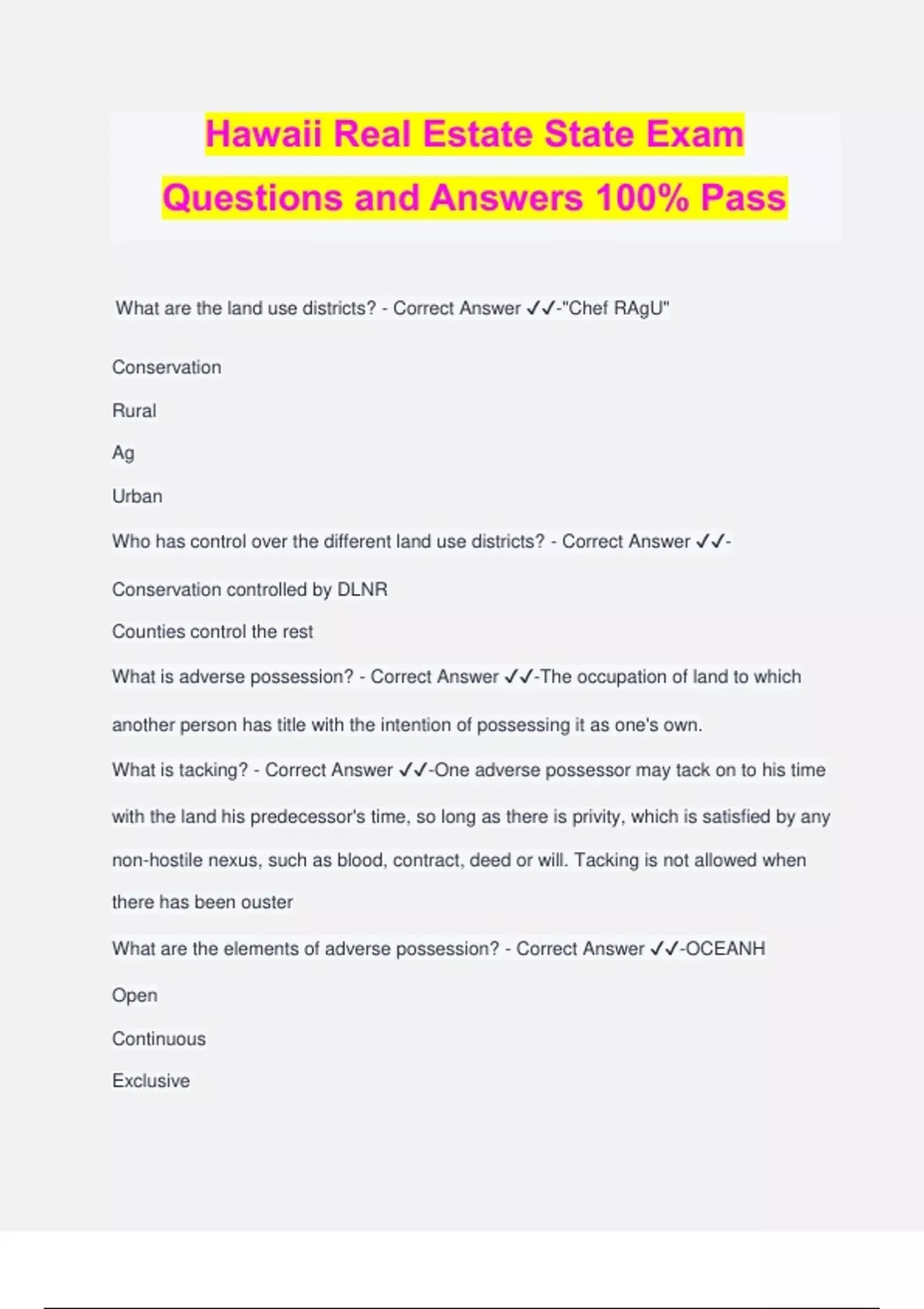 Hawaii Real Estate State Exam Questions and Answers 100% Pass What are the land use districts? - Correct Answer ️️ -"Chef RAgU" Conservation Rural Ag Urban Who has control over the different land use districts? - Correct Answer ️️ - Conservation controlled by DLNR Counties control the rest What is adverse possession? - Correct Answer ️️ -The occupation of land to which another person has title with the intention of possessing it as one's own. What is tacking? - Correct Answer ️️ -One adverse possessor may tack on to his time with the land his predecessor's time, so long as there is privity, which is satisfied by any non-hostile nexus, such as blood, contract, deed or will. Tacking is not allowed when there has been ouster What are the elements of adverse possession? - Correct Answer ️️ -OCEANH Open Continuous Exclusive Actual Notorious Hostile What is the difference between adverse possession and prescriptive easement? - Correct Answer ️️ - What is a purchase money mortgage? - Correct Answer ️️ -Anytime using another mortgage to purchase another property What situations does the de minimis law apply to? - Correct Answer ️️ -Allows tolerances regarding minimum encroaching onto the property of another; encroachments What are the allowable tolerances for the various land use districts? - Correct Answer ️️ -CRAC Commercial - 0.25 ft or 3 in Residential - 0.5 ft or 6 in Agricultural - 0.75 ft or 9 in Conservation - 1.5 ft or 18 in What is the de minimis rule? - Correct Answer ️️ -If the encroaching property is within the tolerance, it is NOT an encroachment. Can a sales contract be amended after the offer has been accepted? - Correct Answer ️️ -Yes If so, what is required when the sales contract is amended after the offer has been accepted? - Correct Answer ️️ -Both parties have to agree and it has to be in writing. What is a land trust? - Correct Answer ️️ -A trust formed specifically to hold real estate--real property is the only asset within the trust. Who has legal title in a land trust? - Correct Answer ️️ -The trustee What interest does the beneficiary have? - Correct Answer ️️ -Personal property interest What happens to the agent's real estate license if the agent fails to renew their license? - Correct Answer ️️ -License becomes forfeited. What happens to the agent's real estate license if the agent fails to complete their continuing education by Dec 31 of the even-numbered year? - Correct Answer ️️ - License becomes inactive. What is a Special Management Area? - Correct Answer ️️ -Area managed by the DLNR granting use permits from the county for any development within certain guidelines. What is a Special Management Area near? - Correct Answer ️️ -Shoreline What documents establishes the shoreline boundary? - Correct Answer ️️ -Shoreline certification - signed by DLNR specifies the shoreline boundary, as of a certain date. How long is this document valid? - Correct Answer ️️ -12 months from the date of the certificate What does "time is of the essence" mean as used in the Purchase Contract? - Correct Answer ️️ -Time is essential. If performance doesn't occur by the contract date, the contract is breached, allowing remedies to the non-breaching party including termination of the contract. When are deposit monies required to be deposited into the client trust account? - Correct Answer ️️ -Next business day What is escrow? - Correct Answer ️️ -A third party that handles monies and makes sure the contract is fulfilled
