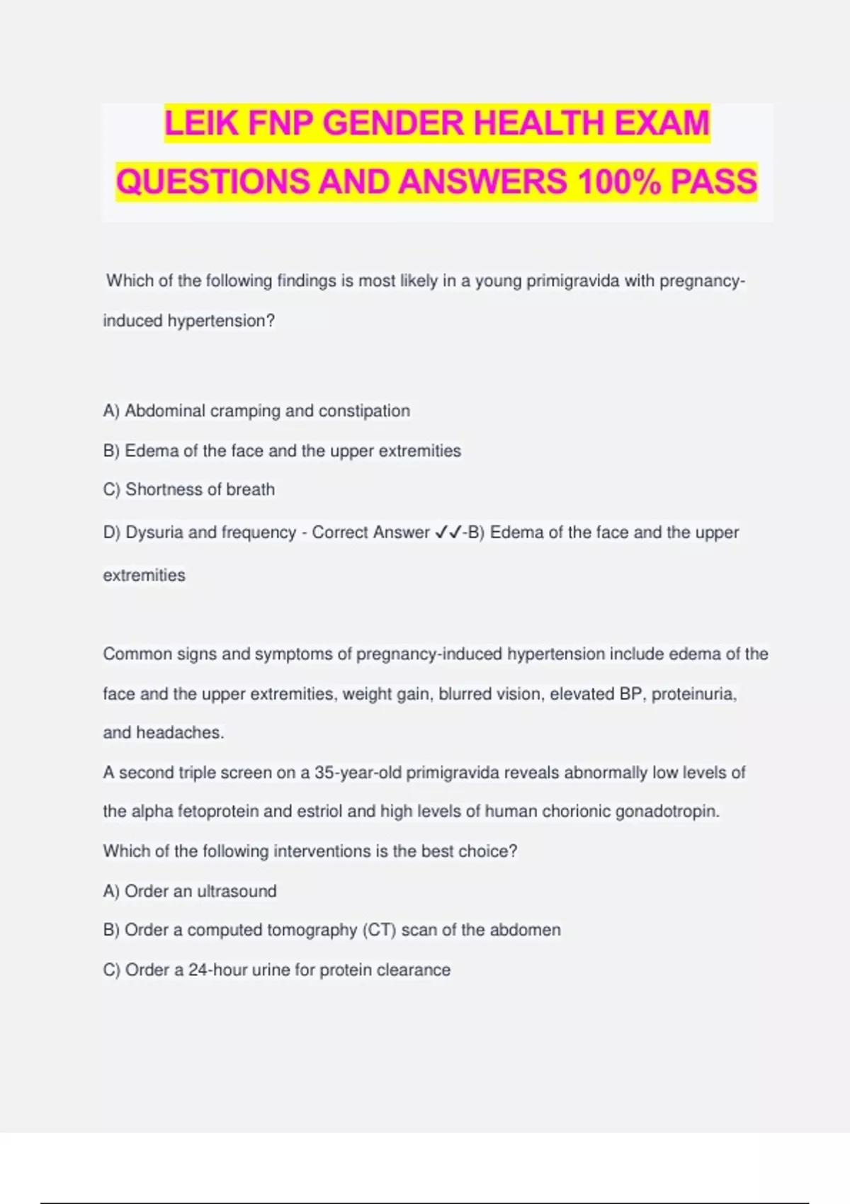 LEIK FNP GENDER HEALTH EXAM QUESTIONS AND ANSWERS 100% PASS Which of the following findings is most likely in a young primigravida with pregnancy- induced hypertension? A) Abdominal cramping and constipation B) Edema of the face and the upper extremities C) Shortness of breath D) Dysuria and frequency - Correct Answer ️️ -B) Edema of the face and the upper extremities Common signs and symptoms of pregnancy-induced hypertension include edema of the face and the upper extremities, weight gain, blurred vision, elevated BP, proteinuria, and headaches. A second triple screen on a 35-year-old primigravida reveals abnormally low levels of the alpha fetoprotein and estriol and high levels of human chorionic gonadotropin. Which of the following interventions is the best choice? A) Order an ultrasound B) Order a computed tomography (CT) scan of the abdomen C) Order a 24-hour urine for protein clearance D) Assess for a history of illicit drug or alcohol use - Correct Answer ️️ -A) Order an ultrasound Abnormally low levels of alpha fetoprotein and estriol and high levels of human chorionic gonadotropin are abnormal during pregnancy. An ultrasound should be ordered to further evaluate the fetus for characteristics of Down syndrome and/or fetal demise. A 35-year-old primigravida who is at 28 weeks of gestation is expecting twins. What would you would expect her alpha fetoprotein (AFP) values to be? A) Normal B) Higher than normal C) Lower than normal D) None of the above - Correct Answer ️️ -B) Higher than normal Alpha fetoprotein is produced in the fetal and maternal liver. Higher levels of alpha fetoprotein are commonly seen in multiple gestations due to the growing fetuses and enlargement of the livers. Fetal TORCH infections can cause microcephaly, mental retardation, hepatospleno- megaly, and intrauterine growth retardation. The acronym TORCH stands for: A) Toxoplasma gondii, other infections, rubella, cytomegalovirus, and herpes B) Toxic shock syndrome, ocular infections, rubella, cytomegalovirus, and herpes zoster C) Tetanus, ophthalmic infections, roseola, cancer, and head abnormalities D) Toxins, other infections, roseola, candidiasis, and head abnormalities - Correct Answer ️️ -A) Toxoplasmagondii, other infections, rubella, cytomegalovirus, and herpes The acronym TORCH stands for Toxoplasma gondii, Other infections, Rubella, Cytomegalovirus, and Herpes. Although several of the conditions listed in the other answer options can also cause fetal problems, they are not included in the TORCH acronym. Human papilloma virus (HPV) infection of the larynx has been associated with: A) Laryngeal neoplasia B) Esophageal stricture C) Cervical cancer D) Metaplasia of esophageal squamous cells - Correct Answer ️️ -A) Laryngeal neoplasia HPV infection of the larynx has been associated with laryngeal neoplasia; HPV infection of the cervix is associated with cervical cancer. A multigravida who is at 28 weeks of gestation has a fundal height of 29 cm. Which of the following is the best recommendation for this patient? A) Advise the mother that her pregnancy is progressing well B) Order an ultrasound of the uterus C) Refer her to an obstetrician for an amniocentesis D) Recommend bed rest with bathroom privileges - Correct Answer ️️ -A) Advise the mother that her pregnancy is progressing well From 20-35 weeks' gestation, fundal height should equal weeks gestation. If greater than 2 cm within the gestational week of pregnancy, further testing should be performed to evaluate fetal growth A multigravida who is at 34 weeks of gestation wants to know at what level her uterine fundus should be. The best answer is to advise the mother that her fundus is: A) Midway between the umbilicus and the lower ribs B) At the level of the umbilicus C) From 33 to 35 cm D) From 32 to 34 cm - Correct Answer ️️ -C) From 33 to 35 cm After 20 weeks gestation, fundal height in centimeters should measure approximately the same as the number of weeks of gestation Precocious puberty is defined as the onset of secondary sexual characteristics before the age of: A) Age 7 in girls and age 8 in boys B) Age 8 in girls and age 9 in boys C) Age 9 in girls and age 10 in boys D) Age 9 for both girls and boys - Correct Answer ️️ -B) Age 8 in girls and age 9 in boys Precocious puberty is defined as onset of secondary sexual characteristics by the age of 8 years in girls and 9 years in boys. At what Tanner stage does puberty start? A) Tanner Stage I B) Tanner Stage II C) Tanner Stage III D) Tanner Stage IV - Correct Answer ️️ -B) Tanner Stage II Puberty is defined as the period in life when secondary sexual characteristics begin to develop, identified as Tanner Stage II for boys and girls. A 14-year-old teen is worried that she has not started to menstruate like most of her friends. During the gynecological examination, the nurse practitioner tells the mother, who is in the room with the patient, that her daughter is starting Tanner Stage II. What are the physical exam findings during this stage? A) Breast buds and some straight pubic hair B) Fully developed breasts and curly pubic hair C) Breast tissue with the areola on a separate mound with curly pubic hair D) No breast tissue and no pubic hair - Correct Answer ️️ -A) Breast buds and some straight pubic hair Tanner Stage II in females includes breast buds and few straight, fine pubic hairs. You note that your 11-year-old female patient is at Tanner Stage II. You would advise her mother that menarche will probably start in: A) 1 to 2 years B) 2.5 to 3 years C) 4 years D) It is dependent on the girl's genetic makeup - Correct Answer ️️ -A) 1 to 2 years Menarche normally begins approximately 1-2 years following Tanner Stage II. Average age is 11.8 years old. The mother of a 16-year-old boy is concerned that her son is not developing normally. On physical exam, the patient is noted to have small testes with no pubic or facial hair. What is the most appropriat