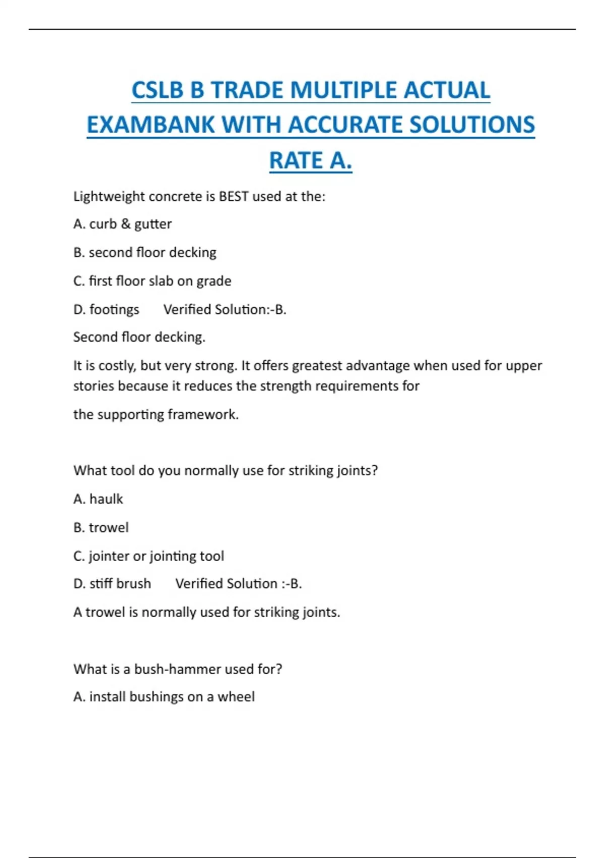 CSLB B TRADE MULTIPLE ACTUAL EXAMBANK WITH ACCURATE SOLUTIONS RATE A.
