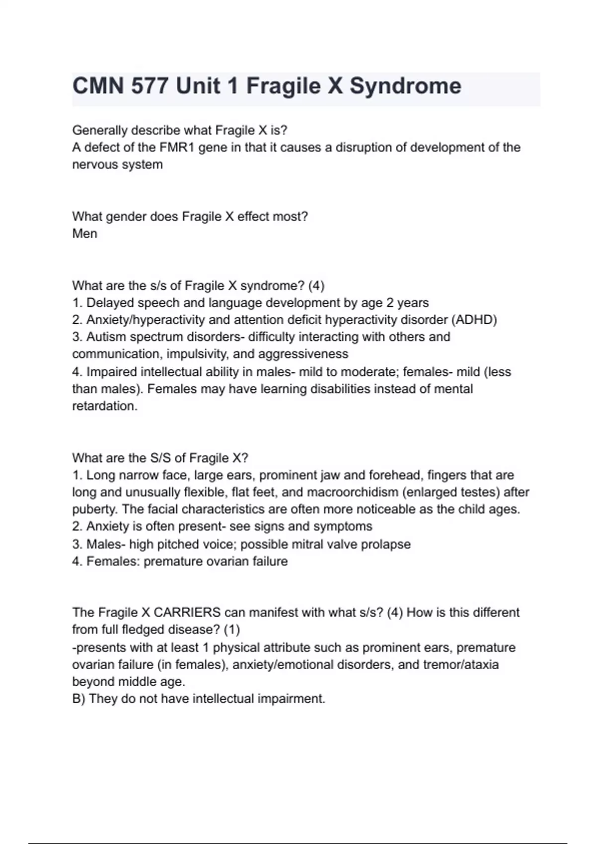 CMN 577 Unit 1 Fragile X Syndrome with complete solution