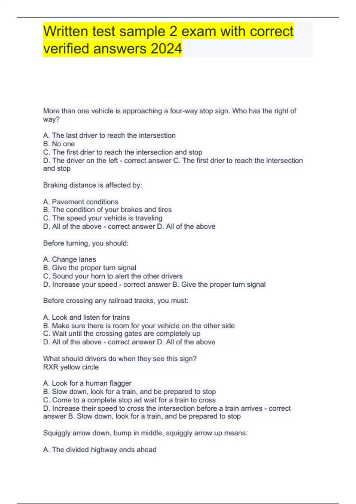 More than one vehicle is approaching a four-way stop sign. Who has the right of way? A. The last driver to reach the intersection B. No one C. The first drier to reach the intersection and stop D. The driver on the left - correct answer C. The first drier to reach the intersection and stop Braking distance is affected by: A. Pavement conditions B. The condition of your brakes and tires C. The speed your vehicle is traveling D. All of the above - correct answer D. All of the above Before turning, you should: A. Change lanes B. Give the proper turn signal C. Sound your horn to alert the other drivers D. Increase your speed - correct answer B. Give the proper turn signal Before crossing any railroad tracks, you must: A. Look and listen for trains B. Make sure there is room for your vehicle on the other side C. Wait until the crossing gates are completely up D. All of the above - correct answer D. All of the above What should drivers do when they see this sign? RXR yellow circle A. Look for a human flagger B. Slow down, look for a train, and be prepared to stop C. Come to a complete stop ad wait for a train to cross D. Increase their speed to cross the intersection before a train arrives - correct answer B. Slow down, look for a train, and be prepared to stop Squiggly arrow down, bump in middle, squiggly arrow up means: A. The divided highway ends ahead B. Drivers are coming to a point where another traffic lane jobs the one they are on C. Reversible lane ahead D. Divided highway ahead - correct answer A. The divided highway ends ahead A 5 oz. glass wine contains the same amount of alcohol as: A. One 12 oz. can of beer B. A 6-pack of beer C. One pint of wine D. A gallon of wine - correct answer A. One 12 oz. can of beer When you prepare to make a left turn from a one-way road into a one-way road, you must: A. move into the right lane, or to the right side of a single lane B. move into the right lane, or to the left side of a single lane C. move into the left lane, or to the left side of a single lane D. None of the above - correct answer C. move into the left lane, or to the left side of a single lane Up arrow down arrow in a yellow diamond means: A. a shared lane starts ahead B. they cannot go straight ahead C. U-turns are now allowed D. they will soon be facing oncoming traffic - correct answer D. they will soon be facing oncoming traffic Sign with up arrow numbers I the middle and don arrows means: A. No passing zone ahead B. Do not enter if your vehicle is taller than the height listed on the sign C. Narrow bridge ahead. Slow down and drive with caution D. None of the above - correct answer B. Do not enter if your vehicle is taller than the height listed on the sign This road sign means: A. winding road ahead B. sharp curve ahead C. no U-turn D. slippery when wet - correct answer D. Slippery when wet The traffic light is green and you want to drive straight through an intersection. If a car is already in the intersection and is making a turn, you must: A. drive through the intersection. You have the right of way B. enter the intersection and then stop C. wait for the next green light D. let that car complete its turn before you enter the intersection - correct answer D. let that car complete its turn before you enter the intersection What should you do if your rear wheels start to skid? A. Take your foot off the gas and shift to neutral B. Turn the steering wheel in the direction the vehicle is trying to go C. If the vehicle has ABS, ump the pedal carefully D. Steer left if your rear wheels slide right - correct answer B. Turn the steering wheel in the direction the vehicle is trying to go When driving on a wet road: A. As you drive faster, your tires may lose traction B. As you decrease your speed, the road becomes more slippery C. You should follow the vehicle ahead of you more closely D. You must be aware that the pavement gets even more slippery when it's been raining for long periods of time - correct answer A. As you drive faster, your tires may lose traction If traffic on the other side of an intersection is backed up and you cannot get completely through, you must: A. enter the intersection and try to avoid blocking it B. turn right instead if going straight through the intersection C. enter the intersection and proceed with caution D. wait until traffic ahead is clear - correct answer D. wait until traffic ahead is clear If another vehicle is approaching you head-on in your lane, you should _______, sound your horn and brake. A. steer left B. none of the answers are correct C. steer right D. stay in the center of your lane - correct answer C. steer right Your blind spot is the area of the road: A. you see in your rearview mirror B. you see in your side mirror C. directly behind your vehicle D. you cannot see without moving your head - correct answer D. you cannot see without moving your head The first sign drivers see when approaching a highway-rail intersection is usually: A. a stop sign B. a crossbuck sign C. a speed limit sign D. an advance warning sign - correct answer D. an advance warning sign "Pavement ends" sign in a yellow diamond means: A. vehicles must leave the pavement immediately B. the road surface ahead changes to a low-type surface or earth road C. the dirt on the side of the road is soft D. none of the above - correct answer B. the road surface ahead changes to a low-type surface or earth road When driving, it is important to keep a space cushion _______ of your vehicle. A. on all sides B. only on the left and right side C. only in back D. only in front - correct answer A. on all sides ___________ normally are white rectangles with black letters or symbols. A. warning signs B. regulation signs (regulatory signs) C. destination signs (guide signs) D. service signs - correct answer B. regulation signs (regulatory signs) Vertical rectangles w/ black borders tell drivers: A. what is not allowed B. the direction they should travel C. the law D. that there's a school
