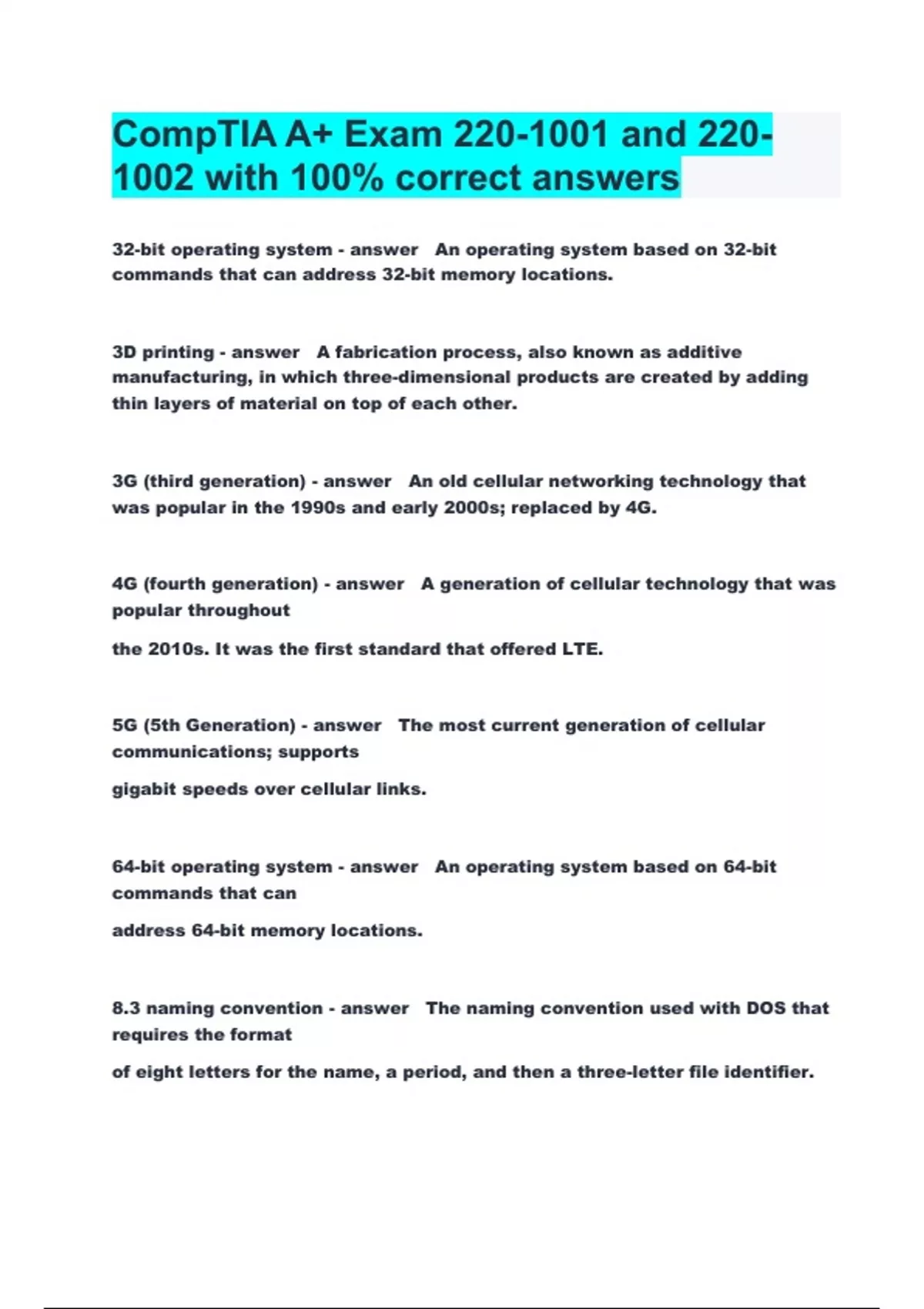 CompTIA A+ Exam 220-1001 and 220-1002 with 100% correct answers
