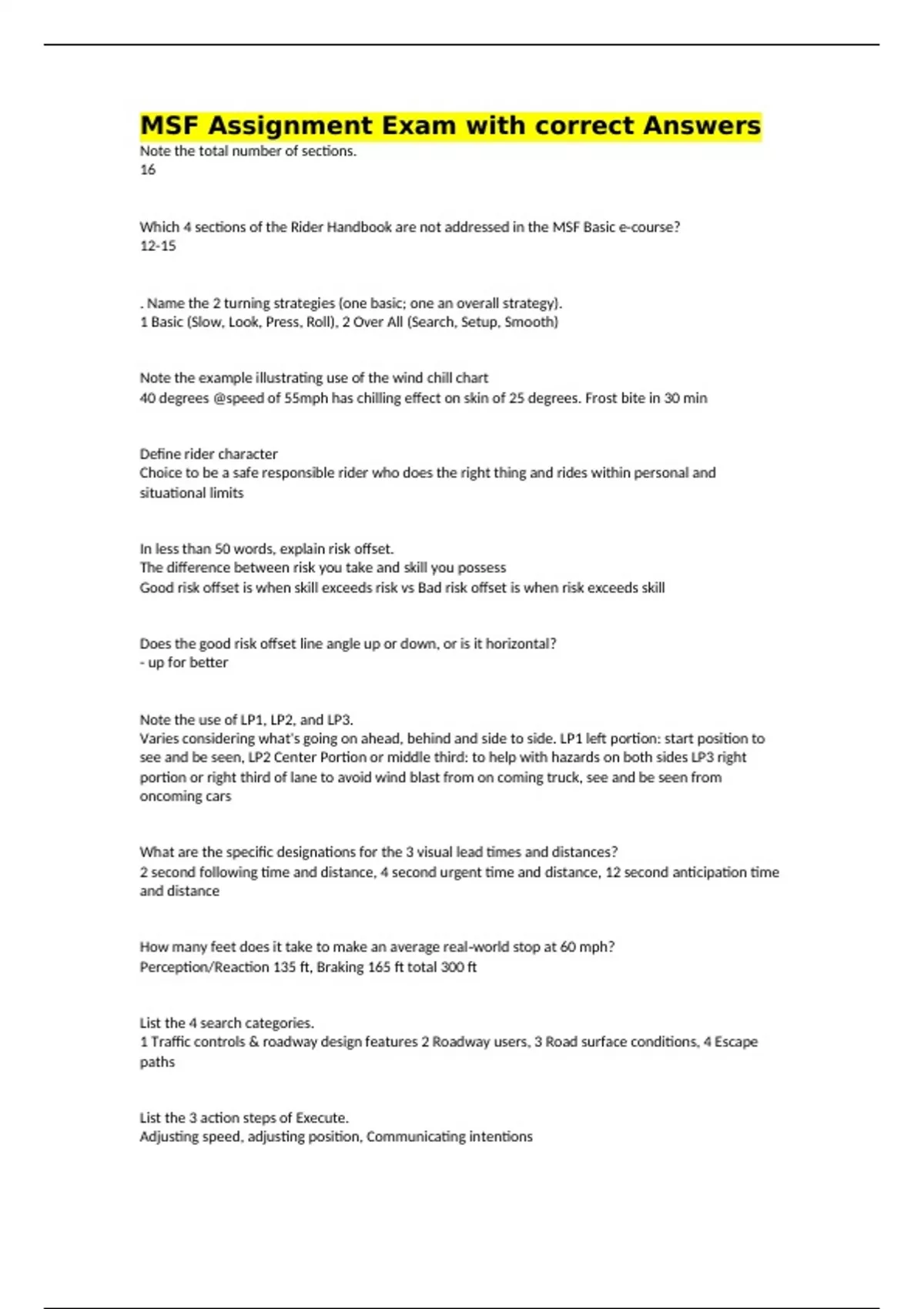 MSF Assignment Exam with correct Answers Note the total number of sections. 16 Which 4 sections of the Rider Handbook are not addressed in the MSF Basic e-course? 12-15 . Name the 2 turning strategies (one basic; one an overall strategy). 1 Basic (Slow, Look, Press, Roll), 2 Over All (Search, Setup, Smooth) Note the example illustrating use of the wind chill chart 40 degrees @speed of 55mph has chilling effect on skin of 25 degrees. Frost bite in 30 min Define rider character Choice to be a safe responsible rider who does the right thing and rides within personal and situational limits In less than 50 words, explain risk offset. The difference between risk you take and skill you possess Good risk offset is when skill exceeds risk vs Bad risk offset is when risk exceeds skill Does the good risk offset line angle up or down, or is it horizontal? - up for better Note the use of LP1, LP2, and LP3. Varies considering what's going on ahead, behind and side to side. LP1 left portion: start position to see and be seen, LP2 Center Portion or middle third: to help with hazards on both sides LP3 right portion or right third of lane to avoid wind blast from on coming truck, see and be seen from oncoming cars What are the specific designations for the 3 visual lead times and distances? 2 second following time and distance, 4 second urgent time and distance, 12 second anticipation time and distance How many feet does it take to make an average real‐world stop at 60 mph? Perception/Reaction 135 ft, Braking 165 ft total 300 ft List the 4 search categories. 1 Traffic controls & roadway design features 2 Roadway users, 3 Road surface conditions, 4 Escape paths List the 3 action steps of Execute. Adjusting speed, adjusting position, Communicating intentions