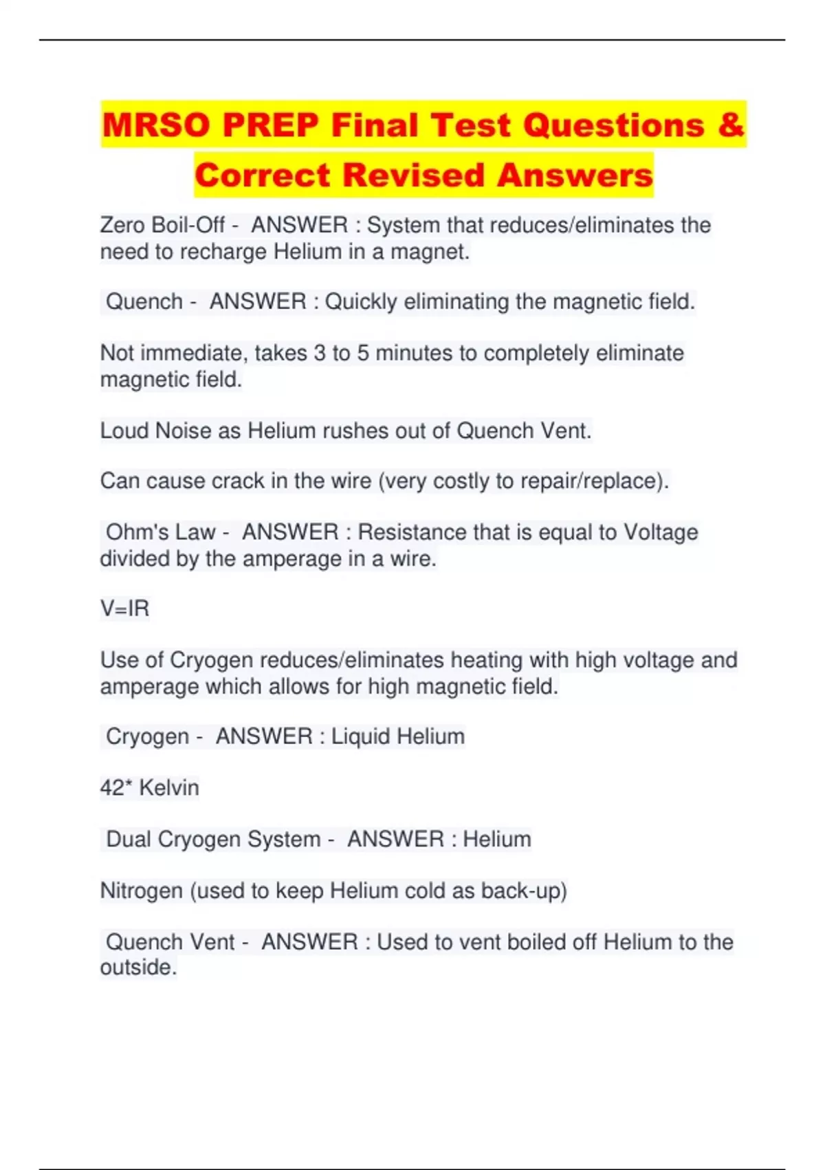 MRSO PREP Final Test Questions & Correct Revised Answers Zero Boil-Off - ANSWER : System that reduces/eliminates the need to recharge Helium in a magnet. Quench - ANSWER : Quickly eliminating the magnetic field. Not immediate, takes 3 to 5 minutes to completely eliminate magnetic field. Loud Noise as Helium rushes out of Quench Vent. Can cause crack in the wire (very costly to repair/replace). Ohm's Law - ANSWER : Resistance that is equal to Voltage divided by the amperage in a wire. V=IR Use of Cryogen reduces/eliminates heating with high voltage and amperage which allows for high magnetic field. Cryogen - ANSWER : Liquid Helium 42* Kelvin Dual Cryogen System - ANSWER : Helium Nitrogen (used to keep Helium cold as back-up) Quench Vent - ANSWER : Used to vent boiled off Helium to the outside. Quench Vent in MRI Room is Zone IV (MRI manufacturer/engineer responsible for inspecting) Quench Vent outside is Zone III (Facility responsible for inspecting) Quench concerns with malfunctioning Quench Vent. - ANSWER : Dense fog in room. Can rain or snow which can contain Oxygen which is a fire risk. Hypothermia/Frostbite due to lowered room temperature. Aphyxiation Ruptured Ear Drums because of increased pressure in room. Difficulty opening door to Zone III due to increased pressure. May have to break window to release pressure. Magnet doesn't immediately lose its magnetic field. Peripheral Nerve stimulation due to change in magnetic field.