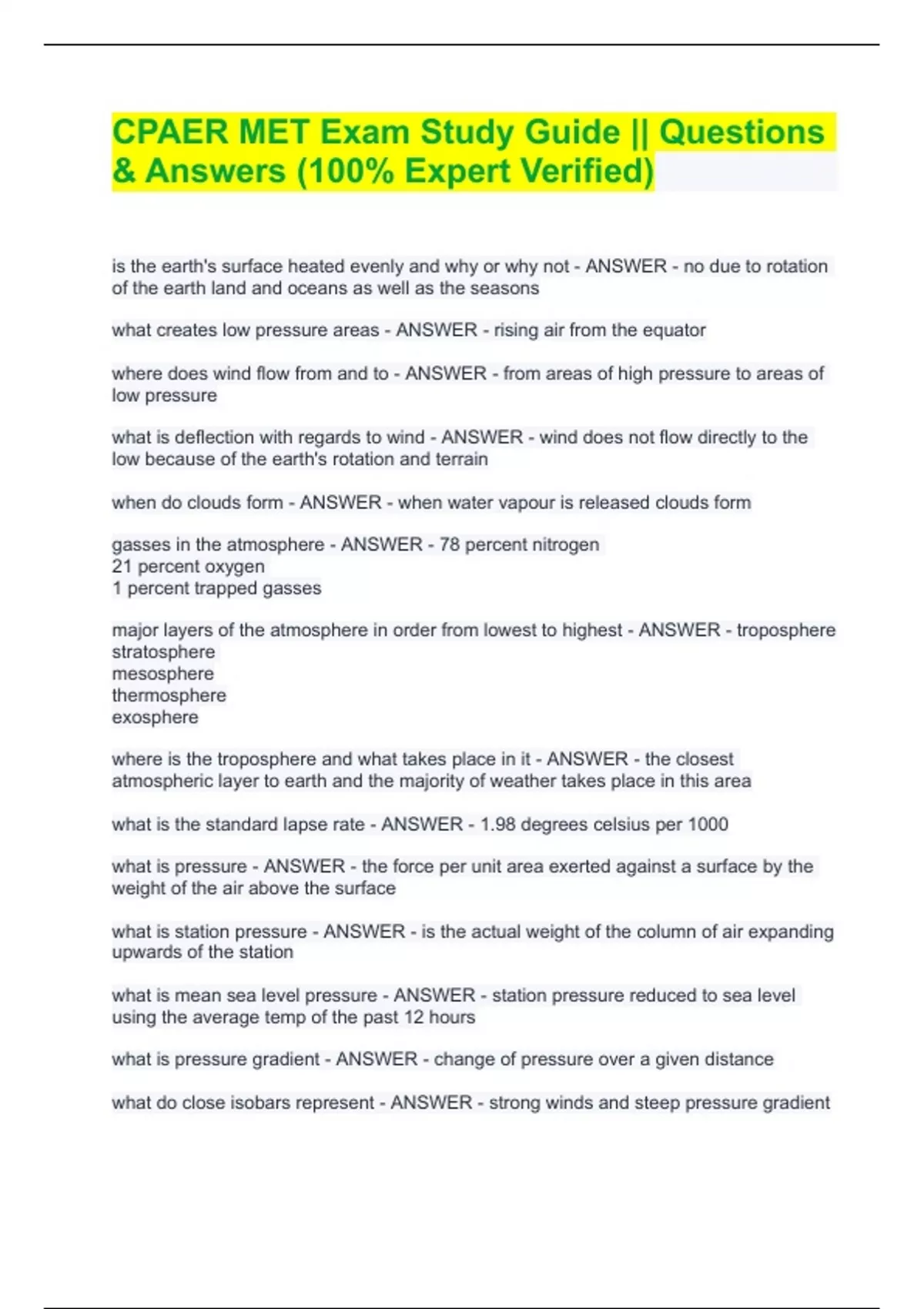 CPAER MET Exam Study Guide || Questions & Answers (100% Expert Verified)CPAER MET Exam Study Guide || Questions & Answers (100% Expert Verified)CPAER MET Exam Study Guide || Questions & Answers (100% Expert Verified)CPAER MET Exam Study Guide || Questions & Answers (100% Expert Verified)CPAER MET Exam Study Guide || Questions & Answers (100% Expert Verified) is the earth's surface heated evenly and why or why not - ANSWER - no due to rotation of the earth land and oceans as well as the seasons what creates low pressure areas - ANSWER - rising air from the equator where does wind flow from and to - ANSWER - from areas of high pressure to areas of low pressure