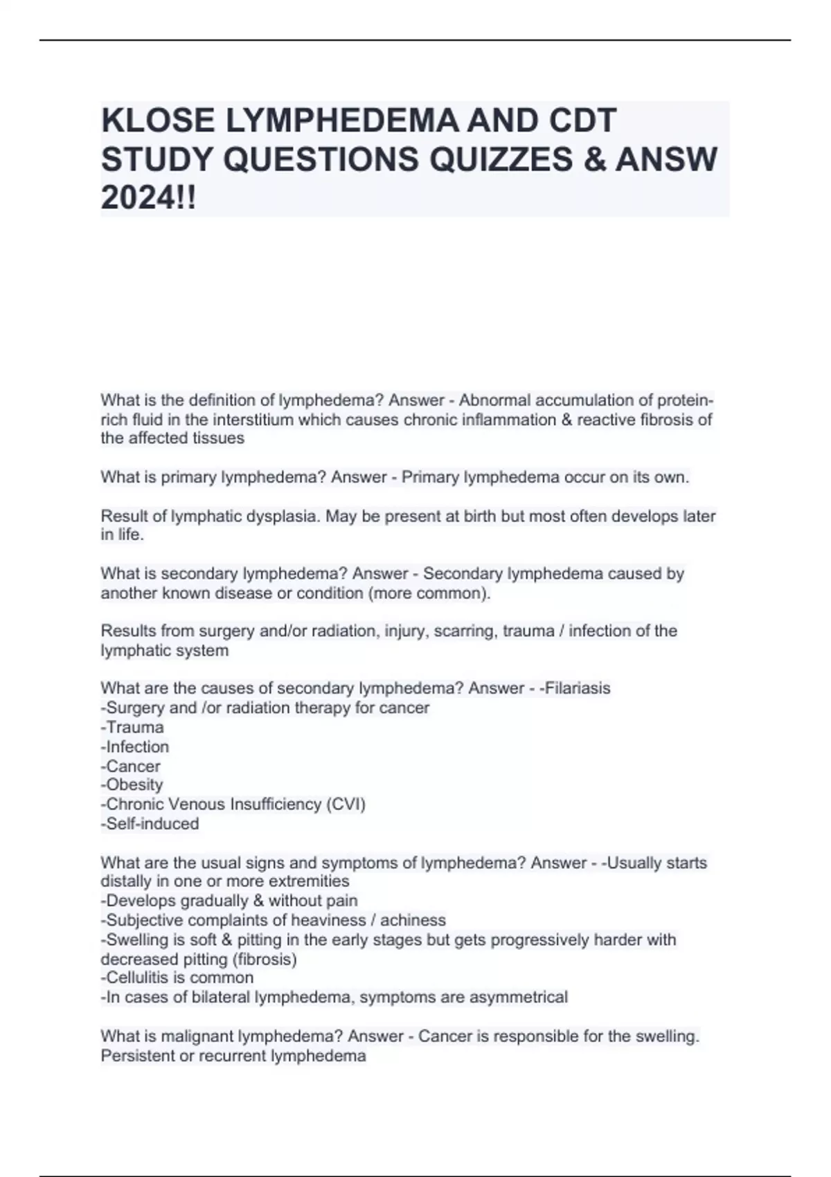 KLOSE LYMPHEDEMA AND CDT STUDY QUESTIONS QUIZZES & ANSW 2024!!