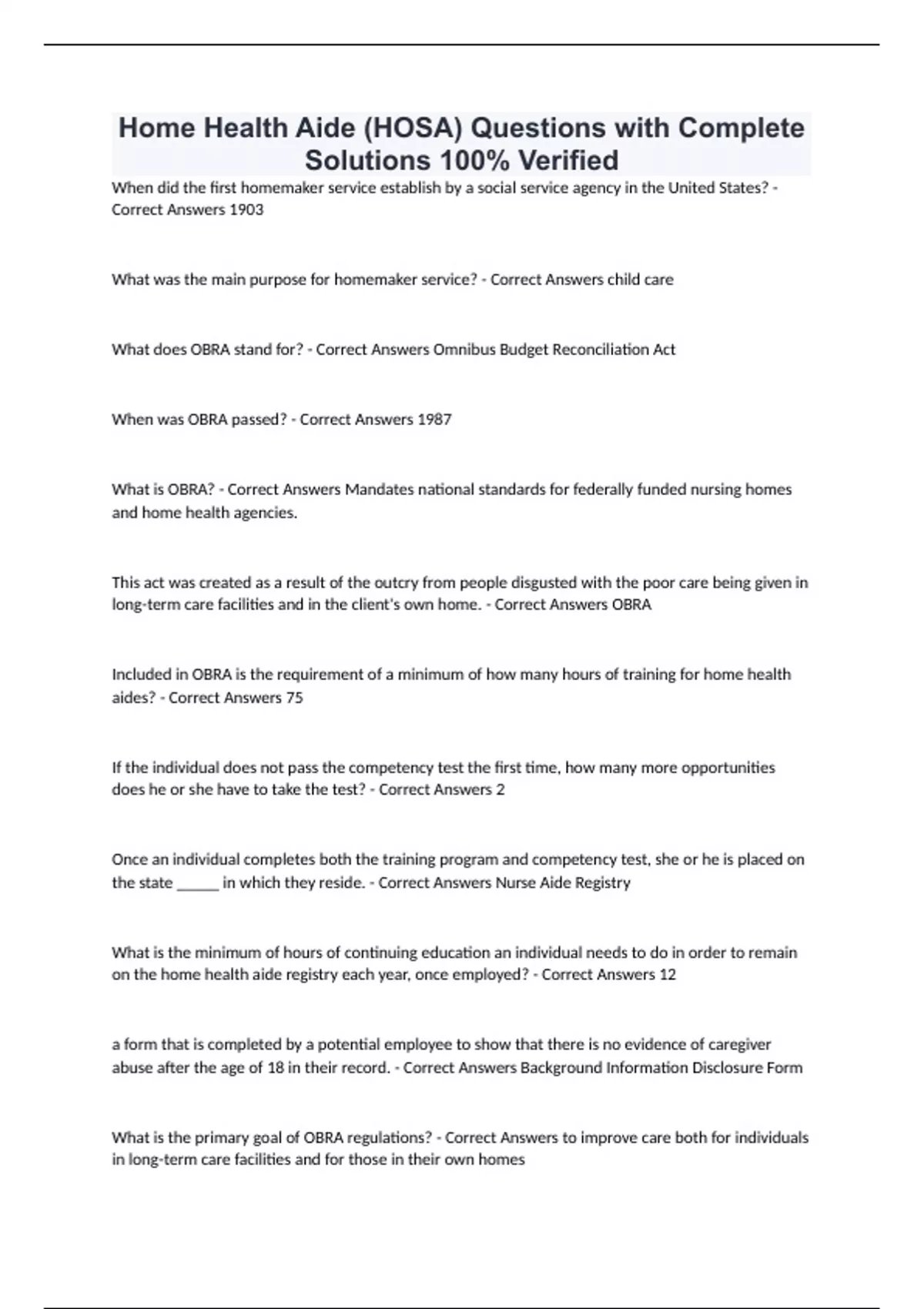 Home Health Aide (HOSA) Questions with Complete Solutions 100% Verified When did the first homemaker service establish by a social service agency in the United States? - Correct Answers 1903 What was the main purpose for homemaker service? - Correct Answers child care What does OBRA stand for? - Correct Answers Omnibus Budget Reconciliation Act When was OBRA passed? - Correct Answers 1987 What is OBRA? - Correct Answers Mandates national standards for federally funded nursing homes and home health agencies. This act was created as a result of the outcry from people disgusted with the poor care being given in long-term care facilities and in the client's own home. - Correct Answers OBRA Included in OBRA is the requirement of a minimum of how many hours of training for home health aides? - Correct Answers 75 If the individual does not pass the competency test the first time, how many more opportunities does he or she have to take the test? - Correct Answers 2 Once an individual completes both the training program and competency test, she or he is placed on the state _____ in which they reside. - Correct Answers Nurse Aide Registry What is the minimum of hours of continuing education an individual needs to do in order to remain on the home health aide registry each year, once employed? - Correct Answers 12 a form that is completed by a potential employee to show that there is no evidence of caregiver abuse after the age of 18 in their record. - Correct Answers Background Information Disclosure Form What is the primary goal of OBRA regulations? - Correct Answers to improve care both for individuals in long-term care facilities and for those in their own homes