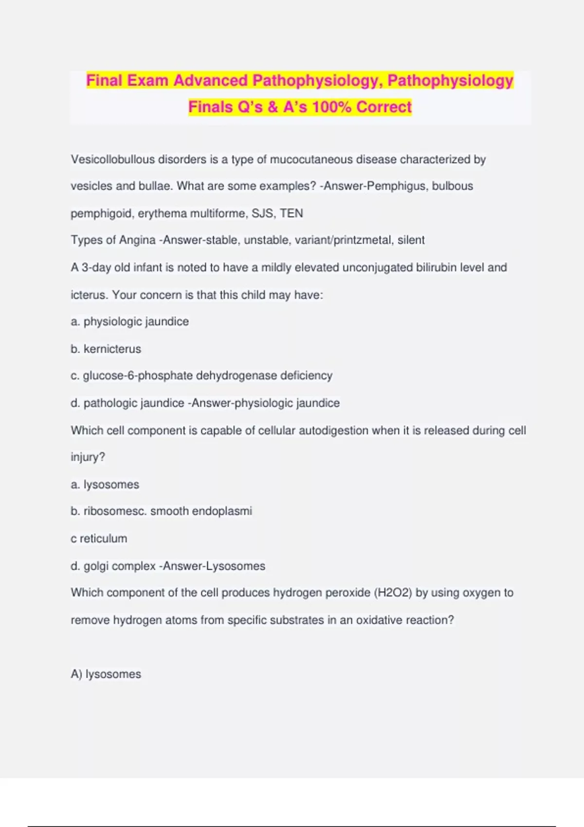 Final Exam Advanced Pathophysiology, Pathophysiology Finals Q’s & A’s 100% Correct Vesicollobullous disorders is a type of mucocutaneous disease characterized by vesicles and bullae. What are some examples? -Answer-Pemphigus, bulbous pemphigoid, erythema multiforme, SJS, TEN Types of Angina -Answer-stable, unstable, variant/printzmetal, silent A 3-day old infant is noted to have a mildly elevated unconjugated bilirubin level and icterus. Your concern is that this child may have: a. physiologic jaundice b. kernicterus c. glucose-6-phosphate dehydrogenase deficiency d. pathologic jaundice -Answer-physiologic jaundice Which cell component is capable of cellular autodigestion when it is released during cell injury? a. lysosomes b. ribosomesc. smooth endoplasmi c reticulum d. golgi complex -Answer-Lysosomes Which component of the cell produces hydrogen peroxide (H2O2) by using oxygen to remove hydrogen atoms from specific substrates in an oxidative reaction? A) lysosomes B) peroxisomes C) ribosomes D) oxyhydrosomes -Answer-Ans: B- peroxisomes The difference between eukaryotes and prokaryotes is that eukaryotes: a. all of these answers are correct b. are smaller in size c. contain organelles d. have no nuclear membrane -Answer-Contain organelles and complex internal membranes What is a consequence of plasma membrane damage to the mitochondria? A) enzymatic digestion halts deoxyribonucleic acid (DNA) synthese B) influx of calcium ions halts adenosine triphosphate (ATP) production C) edema from an influx in sodium causes a reduction in ATP production D) potassium shifts out of the mitochondria, which destroys the infrastructure -Answer- Ans: B- influx of calcium ions halts adenosine triphosphate (ATP) production Which of the following is function of Golgi? a. Packages protein for secretion to the outside of the cell b. Produces ATP for cell function c. Contains hydrolytic enzymes d. Is the site of protein synthesis in a cell -Answer-Packages protein for secretion to the outside of the cell Which statement is a description of one of the characteristics of apoptosis? A) apoptosis involves programmed cell death of scattered singel cells B) apoptosis is characterized by the swelling of the nucleus and the cytoplasm C) apoptosis involves unpredictable patterns of cell death D) apoptosis results in benign malignancies -Answer-Ans: A- apoptosis involves programmed cell death of scattered singel cells During cell injury caused by hypoxia, sodium and water move into the cell because: A) during cell injury cause by hypoxia, sodium and water move into the cell because: B) the pump that transports sodium out of the cell cannot function because of a decrease in adenosine triphosphate (ATP) levels C) the osmotic pressure is increased, which pulls additional sodium across the cell membrane D) oxygen is not available to bind with sodium to maintain it outside of the cell -Answer- Ans: C- the osmotic pressure is increased, which pulls additional sodium across the cell membrane Which of the following is function of the rough endoplasmic reticulum? a. Contains hydrolytic enzymes b. Is the site of protein synthesis in a cell c. Packages protein for secretion to the outside of the cell d. Produces ATP for cell function -Answer-Is the site of protein synthesis in a cell Obesity creates a greater risk for dehydration in people because: A) adipose cells contain little water because fat is water repelling B) the metabolic rates of obese adults are slower than those of lean adults C) the rates of urine output of obese adults are higher than thos of lean adults D) the thirst receptors of the hypothalamus do not function effectively -Answer-Ans: A- adipose cells contain little water because fat is water repelling What genetic process is likely responsible for the occurrence of asthma in only one of a pair of identical twins? a. genomic imprinting b. epigenetic modifications c. methylation d. transgenerational inheritance -Answer-Epigenetic modifications Transcription is best defined as a process by which a. A base pair substitution results in a mutation of the amino acid sequence b. DNA polymerase binds to the promoter site on RNA. c. RNA directs the synthesis of ribosomes for protein synthesis d. RNA is synthesized from a DNA template -Answer-RNA is synthesized from a DNA template What is the most common cause of Down syndrome?