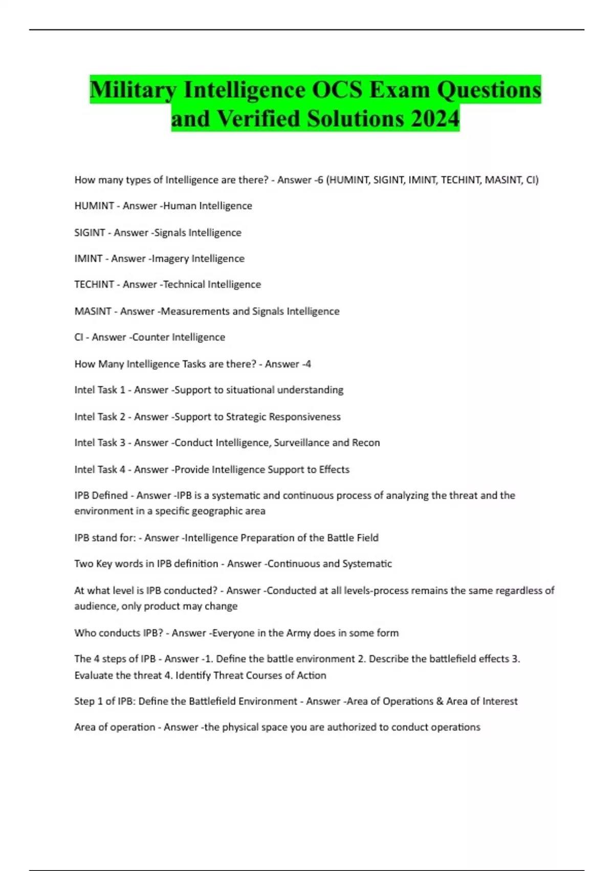 Military Intelligence OCS Exam Questions and Verified Solutions 2024 How many types of Intelligence are there? - Answer -6 (HUMINT, SIGINT, IMINT, TECHINT, MASINT, CI) HUMINT - Answer -Human Intelligence SIGINT - Answer -Signals Intelligence IMINT - Answer -Imagery Intelligence TECHINT - Answer -Technical Intelligence MASINT - Answer -Measurements and Signals Intelligence CI - Answer -Counter Intelligence How Many Intelligence Tasks are there? - Answer -4 Intel Task 1 - Answer -Support to situational understanding Intel Task 2 - Answer -Support to Strategic Responsiveness Intel Task 3 - Answer -Conduct Intelligence, Surveillance and Recon Intel Task 4 - Answer -Provide Intelligence Support to Effects IPB Defined - Answer -IPB is a systematic and continuous process of analyzing the threat and the environment in a specific geographic area IPB stand for: - Answer -Intelligence Preparation of the Battle Field Two Key words in IPB definition - Answer -Continuous and Systematic At what level is IPB conducted? - Answer -Conducted at all levels-process remains the same regardless of audience, only product may change Who conducts IPB? - Answer -Everyone in the Army does in some form The 4 steps of IPB - Answer -1. Define the battle environment 2. Describe the battlefield effects 3. Evaluate the threat 4. Identify Threat Courses of Action Step 1 of IPB: Define the Battlefield Environment - Answer -Area of Operations & Area of Interest Area of operation - Answer -the physical space you are
