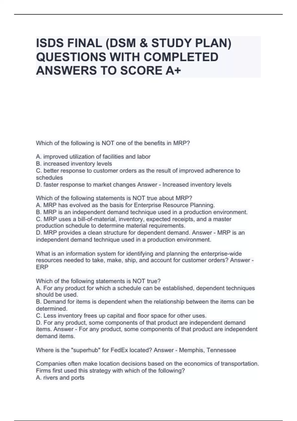 ISDS FINAL (DSM & STUDY PLAN) QUESTIONS WITH COMPLETED ANSWERS TO SCORE A+