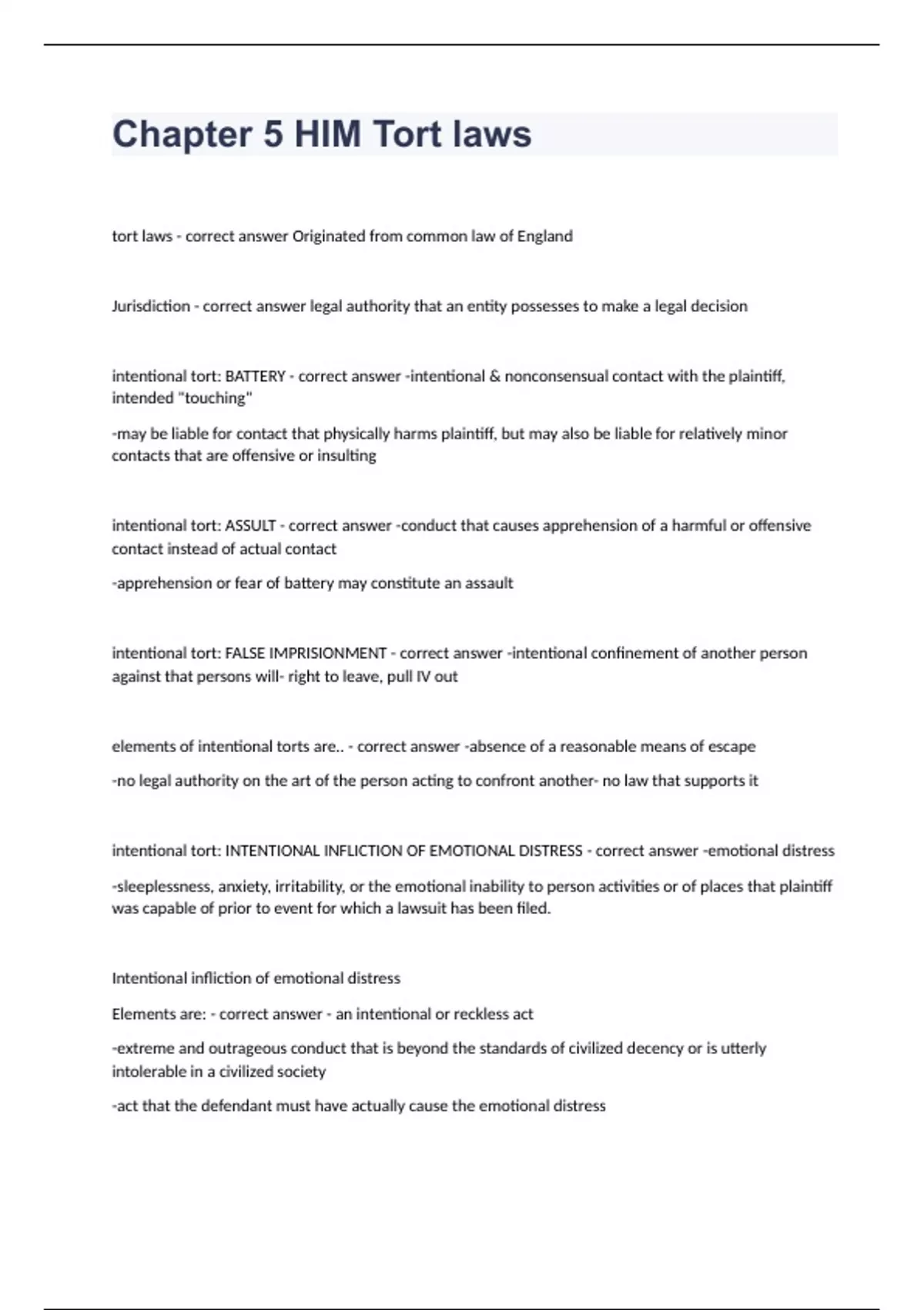 Chapter 5 HIM Tort laws Review Practice Exam Questions 2024. tort laws - correct answer Originated from common law of England Jurisdiction - correct answer legal authority that an entity possesses to make a legal decision intentional tort: BATTERY - correct answer -intentional & nonconsensual contact with the plaintiff, intended "touching" -may be liable for contact that physically harms plaintiff, but may also be liable for relatively minor contacts that are offensive or insulting intentional tort: ASSULT - correct answer -conduct that causes apprehension of a harmful or offensive contact instead of actual contact -apprehension or fear of battery may constitute an assault intentional tort: FALSE IMPRISIONMENT - correct answer -intentional confinement of another person against that persons will- right to leave, pull IV out elements of intentional torts are.. - correct answer -absence of a reasonable means of escape -no legal authority on the art of the person acting to confront another- no law that supports it intentional tort: INTENTIONAL INFLICTION OF EMOTIONAL DISTRESS - correct answer -emotional distress -sleeplessness, anxiety, irritability, or the emotional inability to person activities or of places that plaintiff was capable of prior to event for which a lawsuit has been filed. Intentional infliction of emotional distress Elements are: - correct answer - an intentional or reckless act -extreme and outrageous conduct that is beyond the standards of civilized decency or is utterly intolerable in a civilized society -act that the defendant must have actually cause the emotional distress -the emotional distress suffered by the plaintiff must be "SEVERE" Unintentional torts of Negligence: - correct answer -failure to act in a way that a reasonably prudent person wold act under the same circumstances, thus causing harm or injury to another, careless conduct outside acceptable standards of care types of negligence: - correct answer Malpractice or criminal negligence Negligent torts categorized as: - correct answer -nonfeasance -misfeasance -malfeasance Nonfeasance - correct answer failure to do an act (including protecting another from harm) Misfeasance - correct answer improper performance of an act that a person might lawfully do, or active misconduct that causes injury to another. Malfeasance - correct answer similar to nonfeasance and mis misfeasance, but is categorized by the additional element of intentional conduct in that such conduct is intended to cause damage