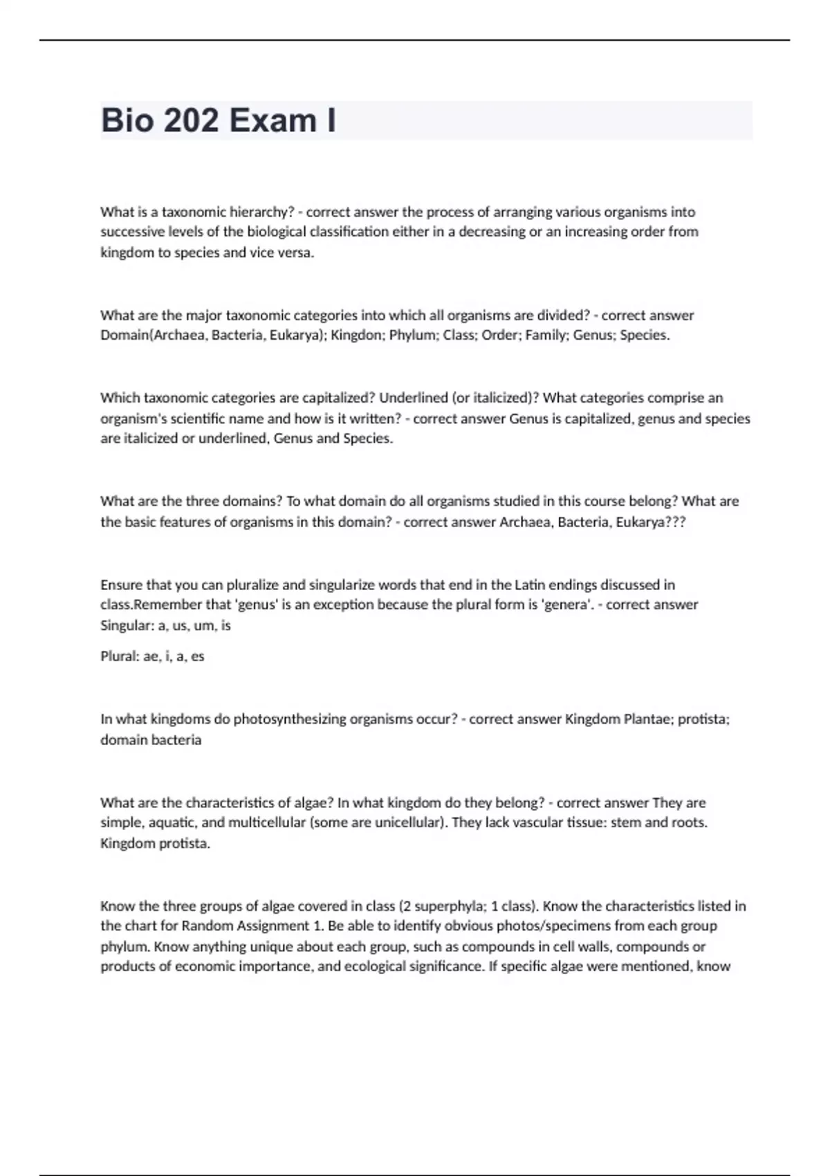 BIO 202 Arizona State University -Bio 202 Exam I fully solved What is a taxonomic hierarchy? - correct answer the process of arranging various organisms into successive levels of the biological classification either in a decreasing or an increasing order from kingdom to species and vice versa. What are the major taxonomic categories into which all organisms are divided? - correct answer Domain(Archaea, Bacteria, Eukarya); Kingdon; Phylum; Class; Order; Family; Genus; Species. Which taxonomic categories are capitalized? Underlined (or italicized)? What categories comprise an organism's scientific name and how is it written? - correct answer Genus is capitalized, genus and species are italicized or underlined, Genus and Species. What are the three domains? To what domain do all organisms studied in this course belong? What are the basic features of organisms in this domain? - correct answer Archaea, Bacteria, Eukarya??? Ensure that you can pluralize and singularize words that end in the Latin endings discussed in class.Remember that 'genus' is an exception because the plural form is 'genera'. - correct answer Singular: a, us, um, is Plural: ae, i, a, es In what kingdoms do photosynthesizing organisms occur? - correct answer Kingdom Plantae; protista; domain bacteria What are the characteristics of algae? In what kingdom do they belong? - correct answer They are simple, aquatic, and multicellular (some are unicellular). They lack vascular tissue: stem and roots. Kingdom protista. Know the three groups of algae covered in class (2 superphyla; 1 class). Know the characteristics listed in the chart for Random Assignment 1. Be able to identify obvious photos/specimens from each group phylum. Know anything unique about each group, such as compounds in cell walls, compounds or products of economic importance, and ecological significance. If specific algae were mentioned, know