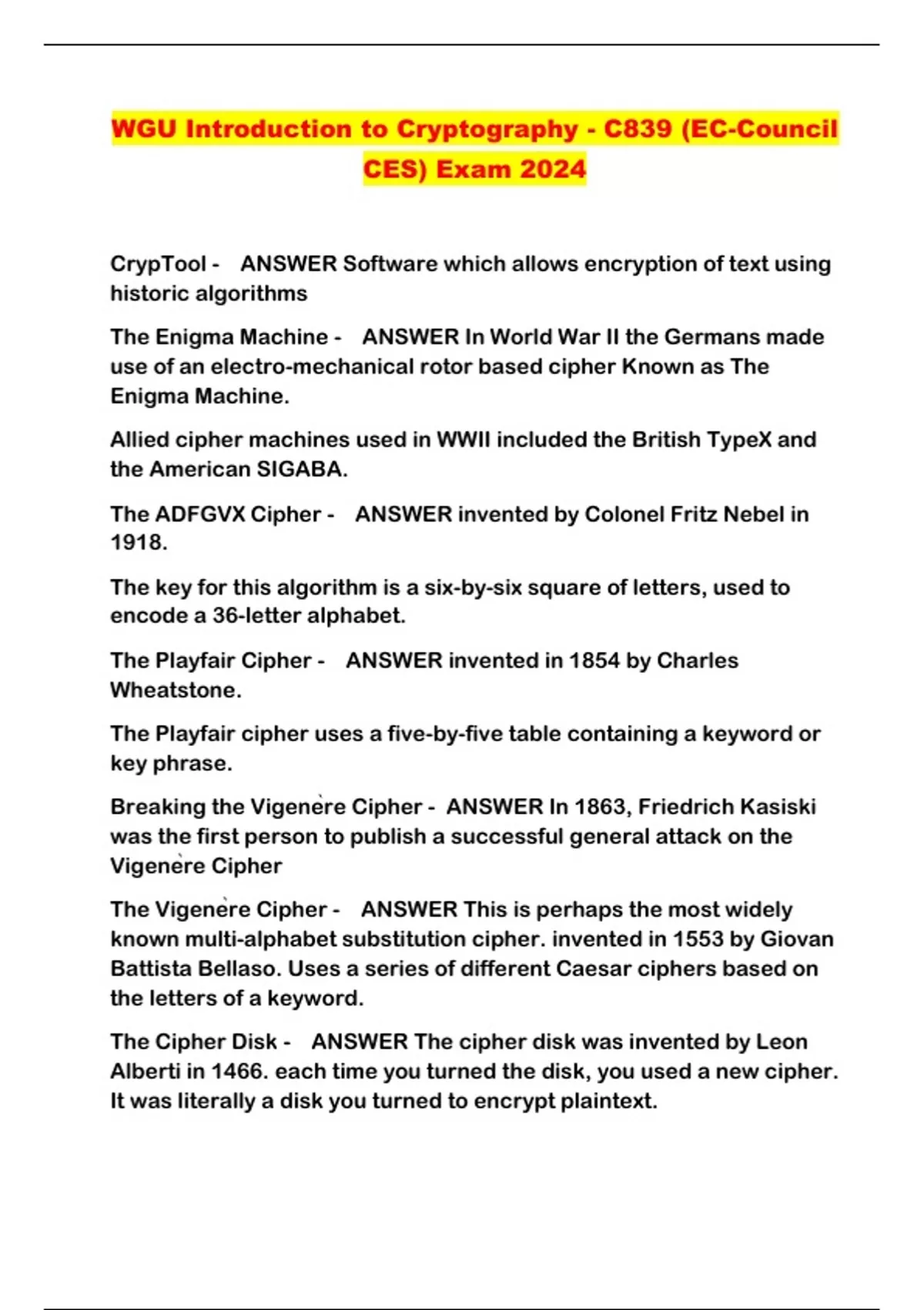 WGU Introduction to Cryptography - C839 (EC-Council CES) Exam 2024...