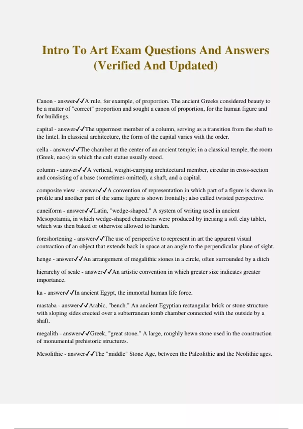 Intro To Art Exam Questions And Answers (Verified And Updated) Canon - answerA rule, for example, of proportion. The ancient Greeks considered beauty to be a matter of "correct" proportion and sought a canon of proportion, for the human figure and for buildings. capital - answerThe uppermost member of a column, serving as a transition from the shaft to the lintel. In classical architecture, the form of the capital varies with the order. cella - answerThe chamber at the center of an ancient temple; in a classical temple, the room (Greek, naos) in which the cult statue usually stood. column - answerA vertical, weight-carrying architectural member, circular in cross-section and consisting of a base (sometimes omitted), a shaft, and a capital. composite view - answerA convention of representation in which part of a figure is shown in profile and another part of the same figure is shown frontally; also called twisted perspective. cuneiform - answerLatin, "wedge-shaped." A system of writing used in ancient Mesopotamia, in which wedge-shaped characters were produced by incising a soft clay tablet, which was then baked or otherwise allowed to harden. foreshortening - answerThe use of perspective to represent in art the apparent visual contraction of an object that extends back in space at an angle to the perpendicular plane of sight. henge - answerAn arrangement of megalithic stones in a circle, often surrounded by a ditch hierarchy of scale - answerAn artistic convention in which greater size indicates greater importance. ka - answerIn ancient Egypt, the immortal human life force. mastaba - answerArabic, "bench." An ancient Egyptian rectangular brick or stone structure with sloping sides erected over a subterranean tomb chamber connected with the outside by a shaft. megalith - answerGreek, "great stone." A large, roughly hewn stone used in the construction of monumental prehistoric structures. Mesolithic - answerThe "middle" Stone Age, between the Paleolithic and the Neolithic ages.