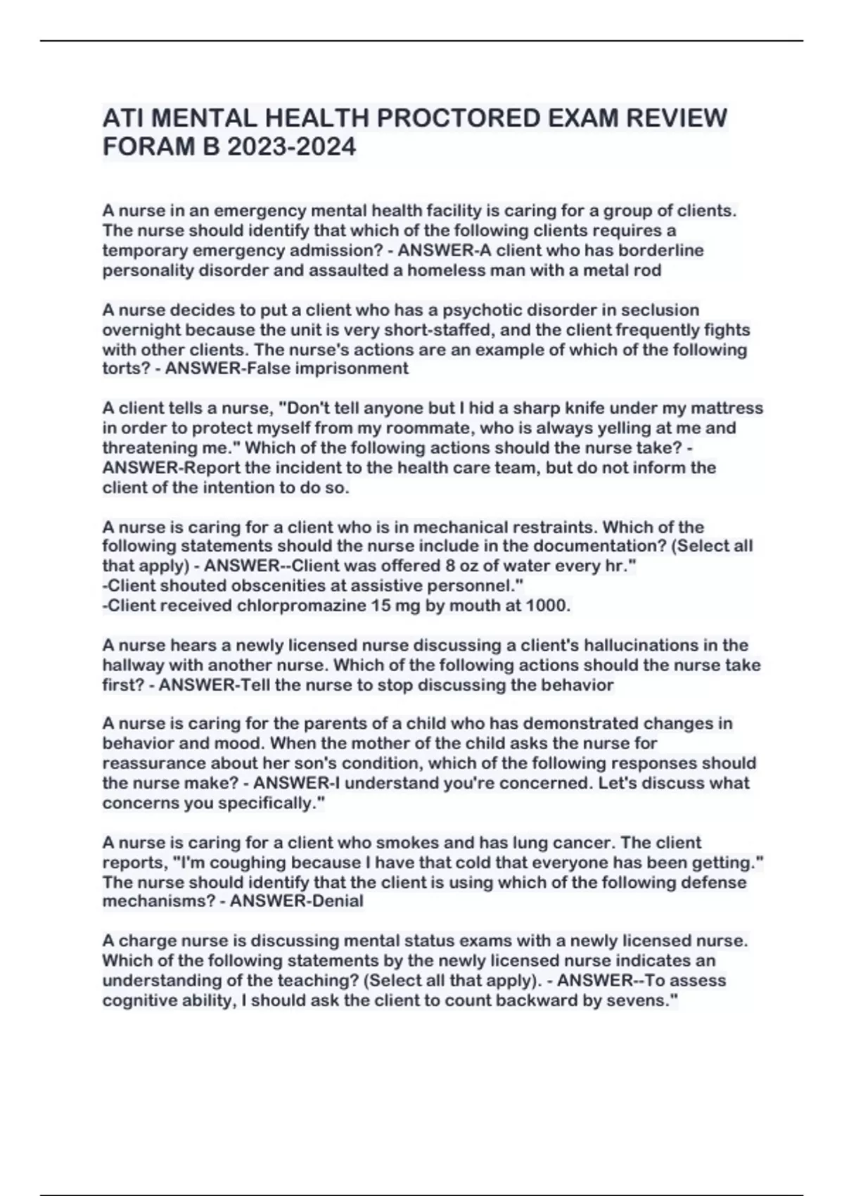 ATI MENTAL HEALTH PROCTORED EXAM REVIEW FORAM B A nurse in an emergency mental health facility is caring for a group of clients. The nurse should identify that which of the following clients requires a temporary emergency admission? - ANSWER-A client who has borderline personality disorder and assaulted a homeless man with a metal rod A nurse decides to put a client who has a psychotic disorder in seclusion overnight because the unit is very short-staffed, and the client frequently fights with other clients. The nurse's actions are an example of which of the following torts? - ANSWER-False imprisonment A client tells a nurse, "Don't tell anyone but I hid a sharp knife under my mattress in order to protect myself from my roommate, who is always yelling at me and threatening me." Which of the following actions should the nurse take? - ANSWER-Report the incident to the health care team, but do not inform the client of the intention to do so. A nurse is caring for a client who is in mechanical restraints. Which of the following statements should the nurse include in the documentation? (Select all that apply) - ANSWER--Client was offered 8 oz of water every hr." -Client shouted obscenities at assistive personnel." -Client received chlorpromazine 15 mg by mouth at 1000. A nurse hears a newly licensed nurse discussing a client's hallucinations in the hallway with another nurse. Which of the following actions should the nurse take first? - ANSWER-Tell the nurse to stop discussing the behavior A nurse is caring for the parents of a child who has demonstrated changes in behavior and mood. When the mother of the child asks the nurse for reassurance about her son's condition, which of the following responses should the nurse make? - ANSWER-I understand you're concerned. Let's discuss what concerns you specifically." A nurse is caring for a client who smokes and has lung cancer. The client reports, "I'm coughing because I have that cold that everyone has been getting." The nurse should identify that the client is using which of the following defense mechanisms? - ANSWER-Denial