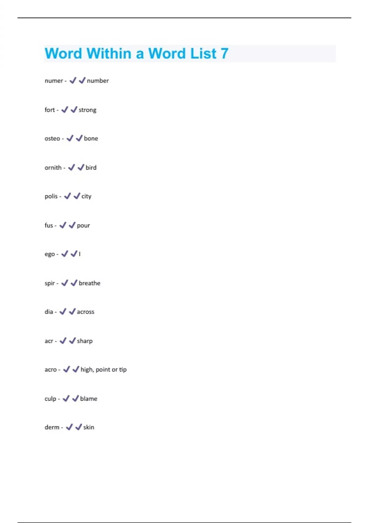 numer - number fort - strong osteo - bone ornith - bird polis - city fus - pour ego - I spir - breathe dia - across acr - sharp acro - high, point or tip culp - blame derm - skinzo - animal per - through pac - peace brev - short necro - death urb - city pugn - fight ecto - outer plasto - molded agog - leader cle - small il - not