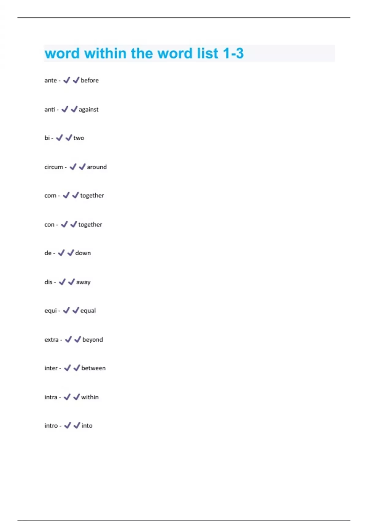 ante - before anti - against bi - two circum - around com - together con - together de - down dis - away equi - equal extra - beyond inter - between intra - within intro - intomal - bad mis - bad non - not post - after pre - before semi - half sub - under super - over syn - together sym - together tri - three un - not homo - same spec - lookduct - lead fer - carry pend - hang
