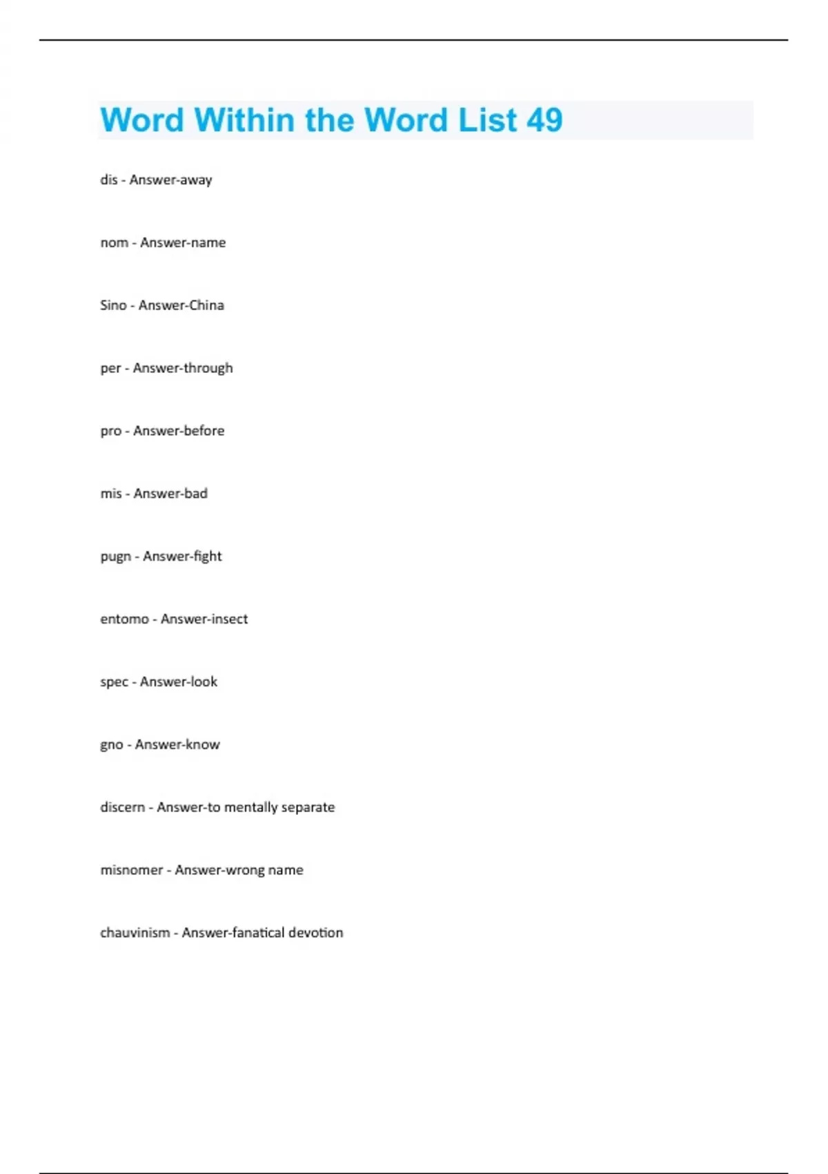 dis - Answer-away nom - Answer-name Sino - Answer-China per - Answer-through pro - Answer-before mis - Answer-bad pugn - Answer-fight entomo - Answer-insect spec - Answer-look gno - Answer-know discern - Answer-to mentally separate misnomer - Answer-wrong name chauvinism - Answer-fanatical devotioninexpegnable - Answer-unconquerable etiology - Answer-science of causes hebetude - Answer-state of dullness axiology - Answer-study of value congeries - Answer-heap Sinology - Answer-study of China nonentitiy - Answer-a nobody prognosis - Answer-medical forecast entomology - Answer-insect zoology perspicacity - Answer-insight synthesis - Answer-combination mobecracy - Answer-mob rule