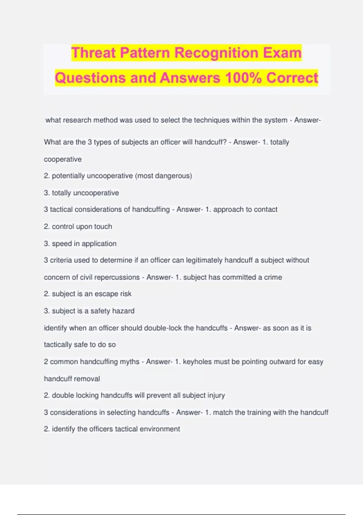Threat Pattern Recognition Exam Questions and Answers 100% Correct what research method was used to select the techniques within the system - Answer- What are the 3 types of subjects an officer will handcuff? - Answer- 1. totally cooperative 2. potentially uncooperative (most dangerous) 3. totally uncooperative 3 tactical considerations of handcuffing - Answer- 1. approach to contact 2. control upon touch 3. speed in application 3 criteria used to determine if an officer can legitimately handcuff a subject without concern of civil repercussions - Answer- 1. subject has committed a crime 2. subject is an escape risk 3. subject is a safety hazard identify when an officer should double-lock the handcuffs - Answer- as soon as it is tactically safe to do so 2 common handcuffing myths - Answer- 1. keyholes must be pointing outward for easy handcuff removal 2. double locking handcuffs will prevent all subject injury 3 considerations in selecting handcuffs - Answer- 1. match the training with the handcuff 2. identify the officers tactical environment 3. subject compliance and cooperation 2 mechanical failures commonly experienced in handcuffs - Answer- 1. officer may have trouble in unlocking the handcuffs with his/her key 2. the single bar will not rotate smoothly through the rachets describe escort position, including positioning and distance - Answer- - method of control primarily used to escort a detained or arrested subject - close proximity is important: minimize subjects ability to counter strike, officer can deliver a knee strike, enhances the ability to disrupt subjects balance for takedowns identify relative position from which an officer should apply escort position - Answer- 2 - 1/2, with officers inside shoulder just behind subjects shoulder identify two common forms of resistance from the escort position and the applicable joint lock for each - Answer- -side curl: transport wrist lock - straight-arm lockout: straight armbar takedown identify the primary distraction technique used from the escort position - Answer- Knee strike - delivered to the common peroneal identify when the inside takedown should be applied - Answer- utilized anytime officer is in front of subject - method of grounding subject in order to exert control to prevent further resistance what is history of the use of force training system you adopted - Answer- what documented research does this system have to validate the techniques and training components - Answer- what is the basic philosophy of the system; control, self defense, martial arts - Answer